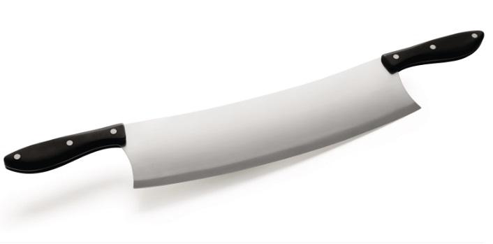 - Простота в использовании: Наш двуручный нож работает по принципу детских качелей. Просто надавливайте поочередно на правую и левую ручки, чтобы получить идеальные кусочки пиццы, пирога, лепёшки или нарезать зелень, мясо, сыр и другие продукты.