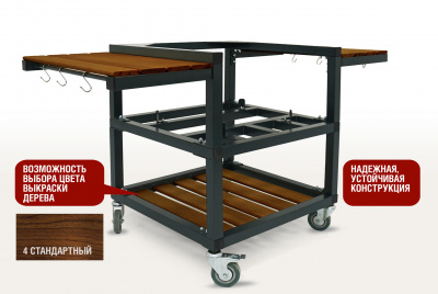 Комплектация гриля включает в себя модуль со столиками Start Grill, который представляет собой удобную альтернативу базовой подставке. Его надежная конструкция с большими транспортировочными колесами и двумя складными боковыми столиками делает перемещение гриля легким и удобным. Шесть крючков для аксессуаров и удобная ниша для хранения обеспечивают удобство в использовании.