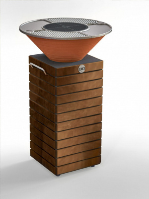 Этот гриль диаметром 750 мм установлен на разборной прямоугольной подставке, которая облицована термодеревом, придавая ему стильный и экологичный вид, идеально подходящий для различных эко-интерьеров, таких как банные комплексы, базы отдыха и террасы ресторанов.