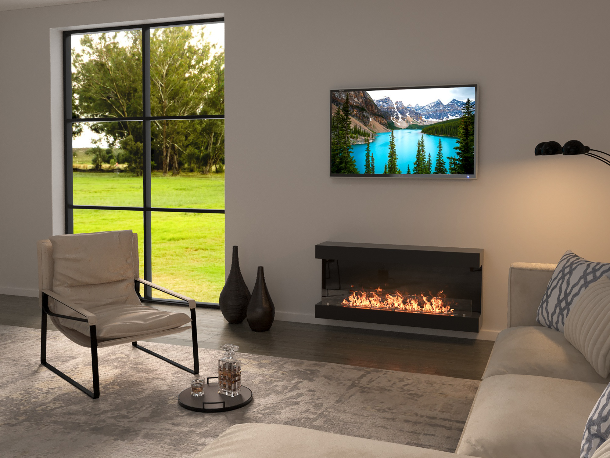 - Линия огня 75 см: Широкая линия огня длиной 75 см создает впечатляющий визуальный эффект, добавляя динамику и тепло в интерьер. Открытые торцы делают пламя еще более эффектным и зрелищным.