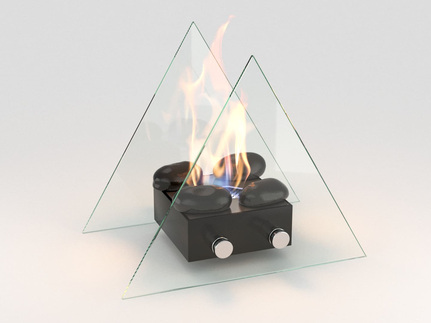 Защитные закалённые стёкла треугольной формы с двух сторон создают красивую «витрину» для огня: пламя видно отлично, а сама композиция выглядит лёгкой и эстетичной. Идеально, если хочется не просто огонь, а красивую подачу.