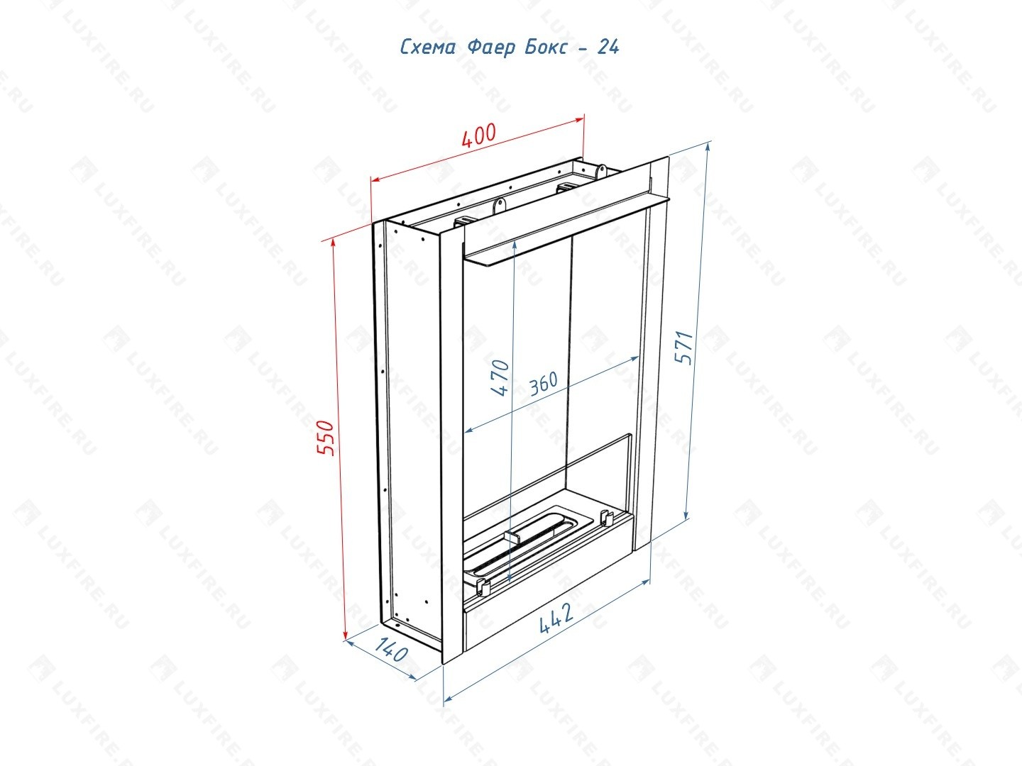 В комплекте уже есть всё ключевое: портальный биокамин Lux Fire «Фаер Бокс 24», топливный блок Lux Fire 250 XS, защитное стекло высотой 12 см, термоизолятор, кочерга, паспорт и гарантийный талон, упаковка. Это значит, что вы получаете не «пустой корпус», а полноценный набор, готовый к установке и эксплуатации.