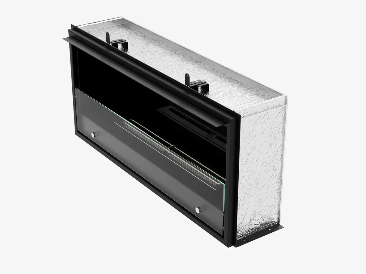 Внутри — собранная металлическая конструкция класса XS, защищённая термоизолятором и дополнительным контейнером в основании очага. Это сделано для того, чтобы портал и ниша чувствовали себя уверенно, а вы — спокойно наслаждались огнём.