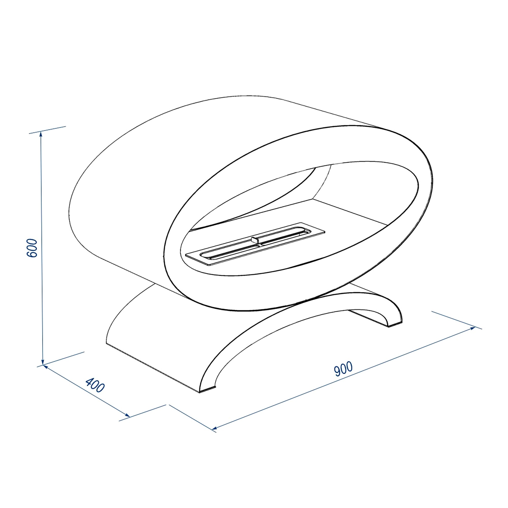 Благодаря ширине 90 см, высоте 60 см и длине 40 см камин выглядит солидно и эффектно, оставаясь при этом компактным для установки в квартирах и загородных домах. Его форма эллипса придаёт очагу уникальность и визуальную лёгкость.