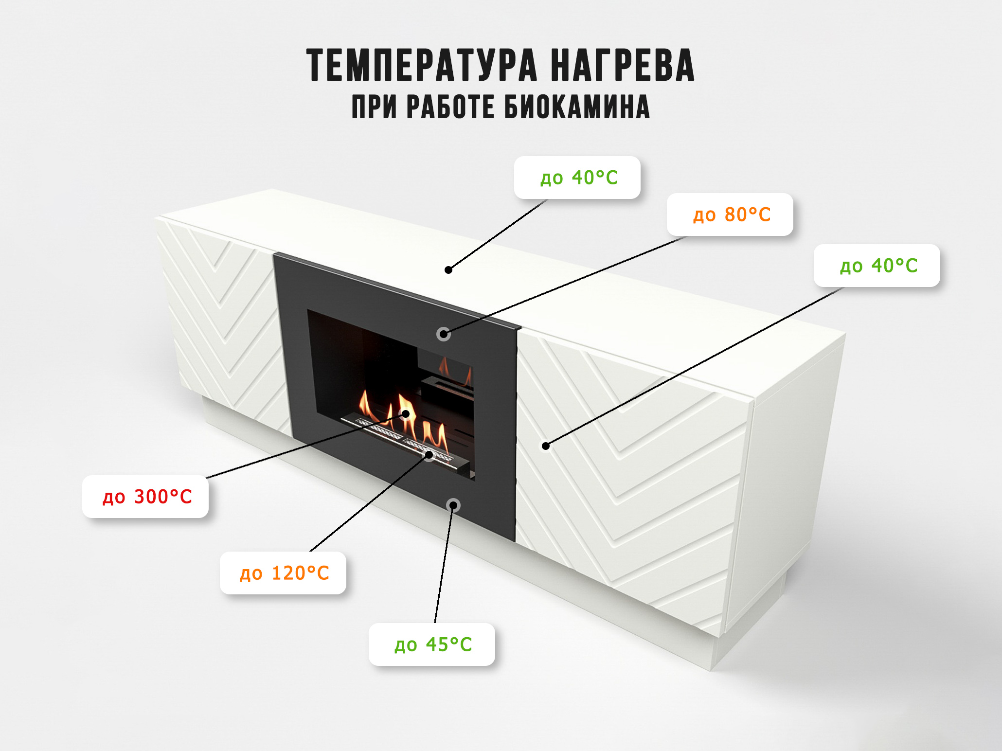 - Безопасное расположение: Задняя и верхняя части биокамина не соприкасаются с корпусом тумбы и стеной помещения, что дополнительно снижает риск перегрева и возгорания.