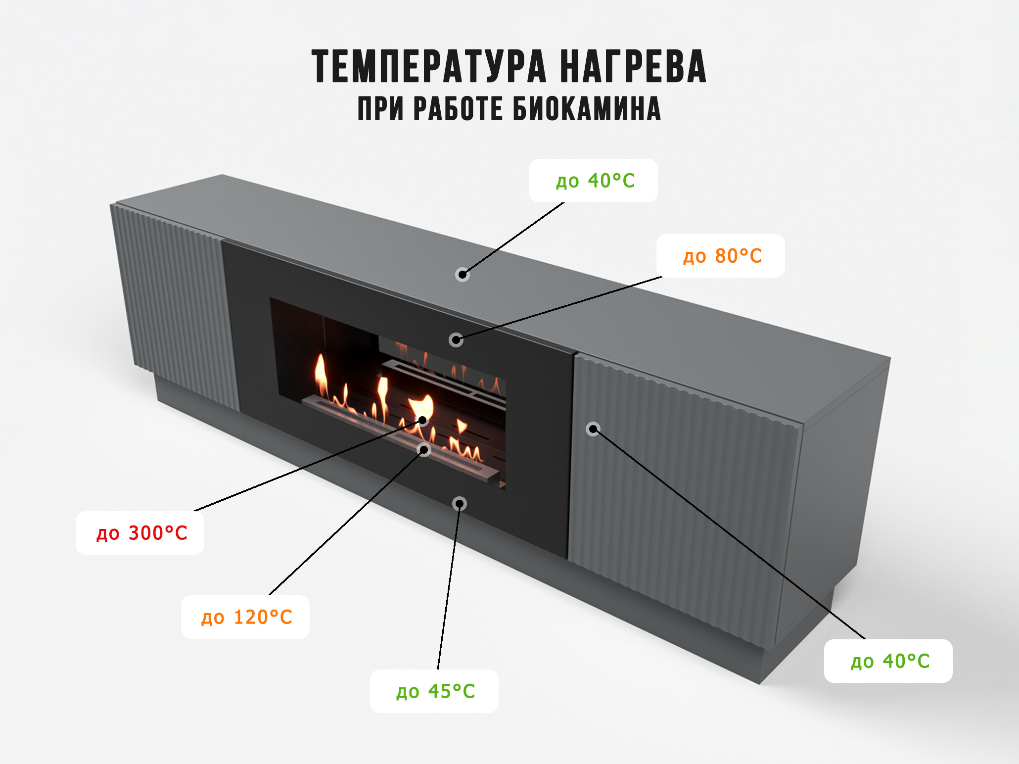 - Безопасное расположение: Задняя и верхняя части биокамина не соприкасаются с корпусом тумбы и стеной помещения, что снижает риск перегрева и возгорания.