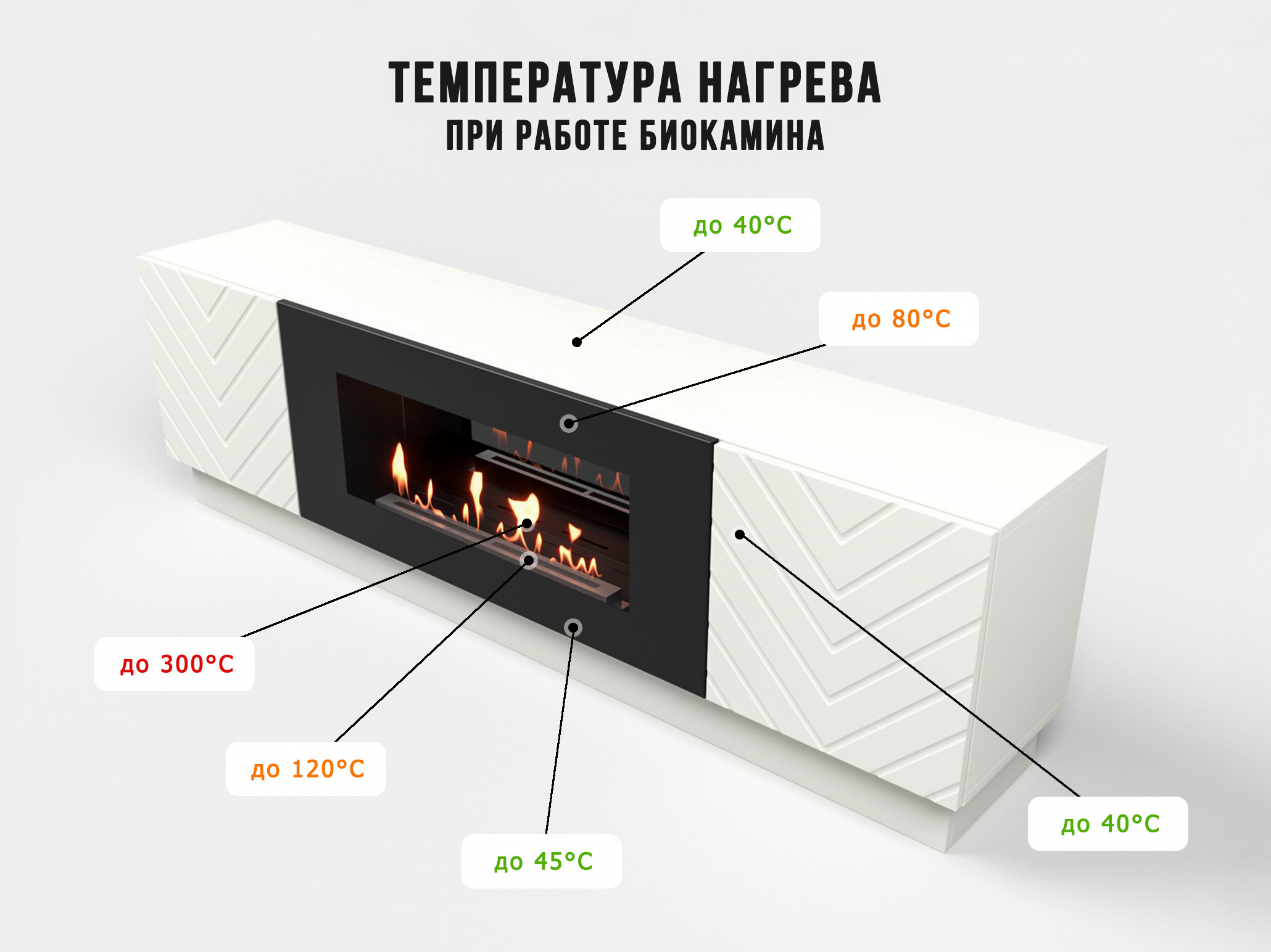 - Безопасное расположение: Задняя и верхняя части биокамина не соприкасаются с корпусом тумбы и стеной помещения, что снижает риск перегрева и возгорания.