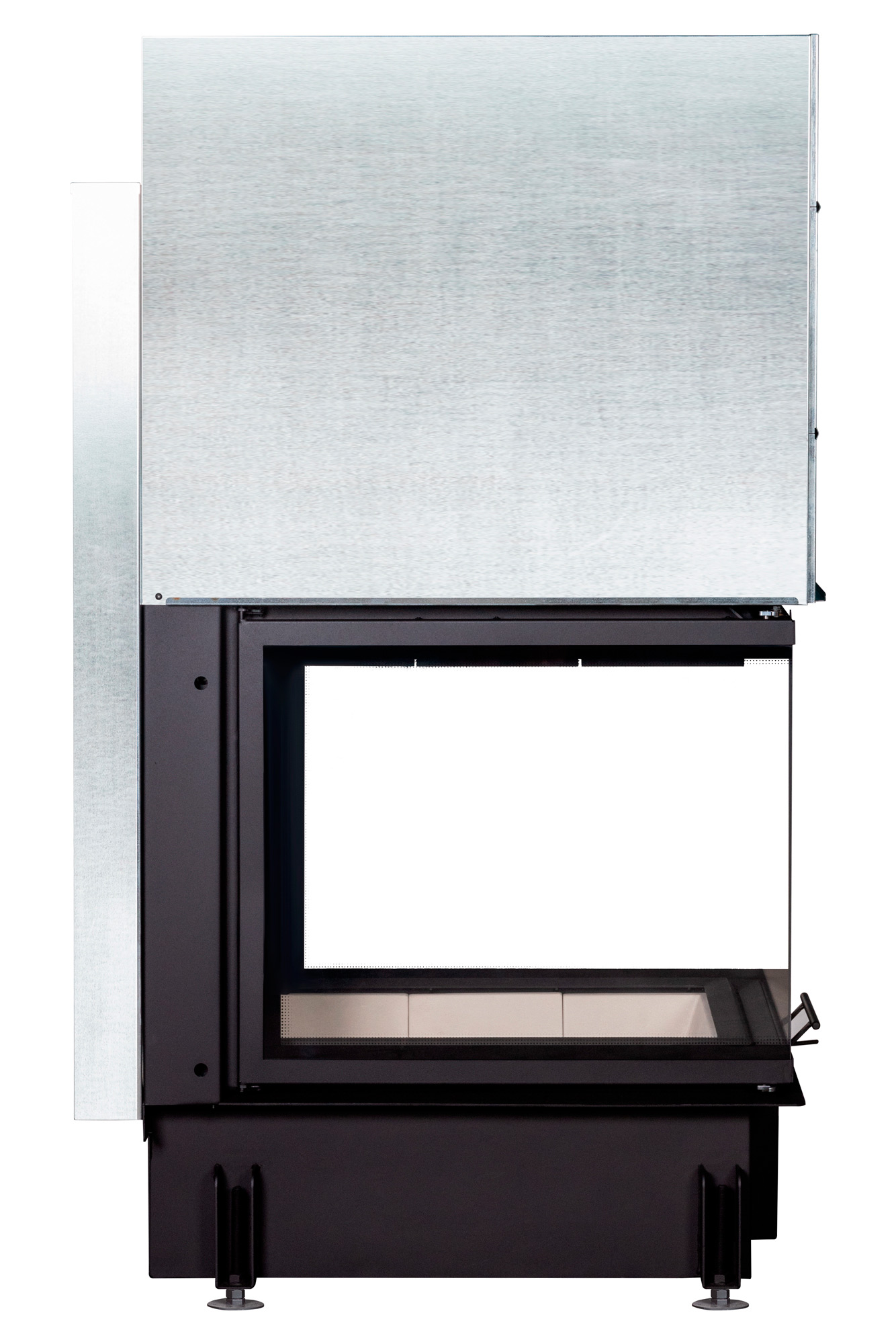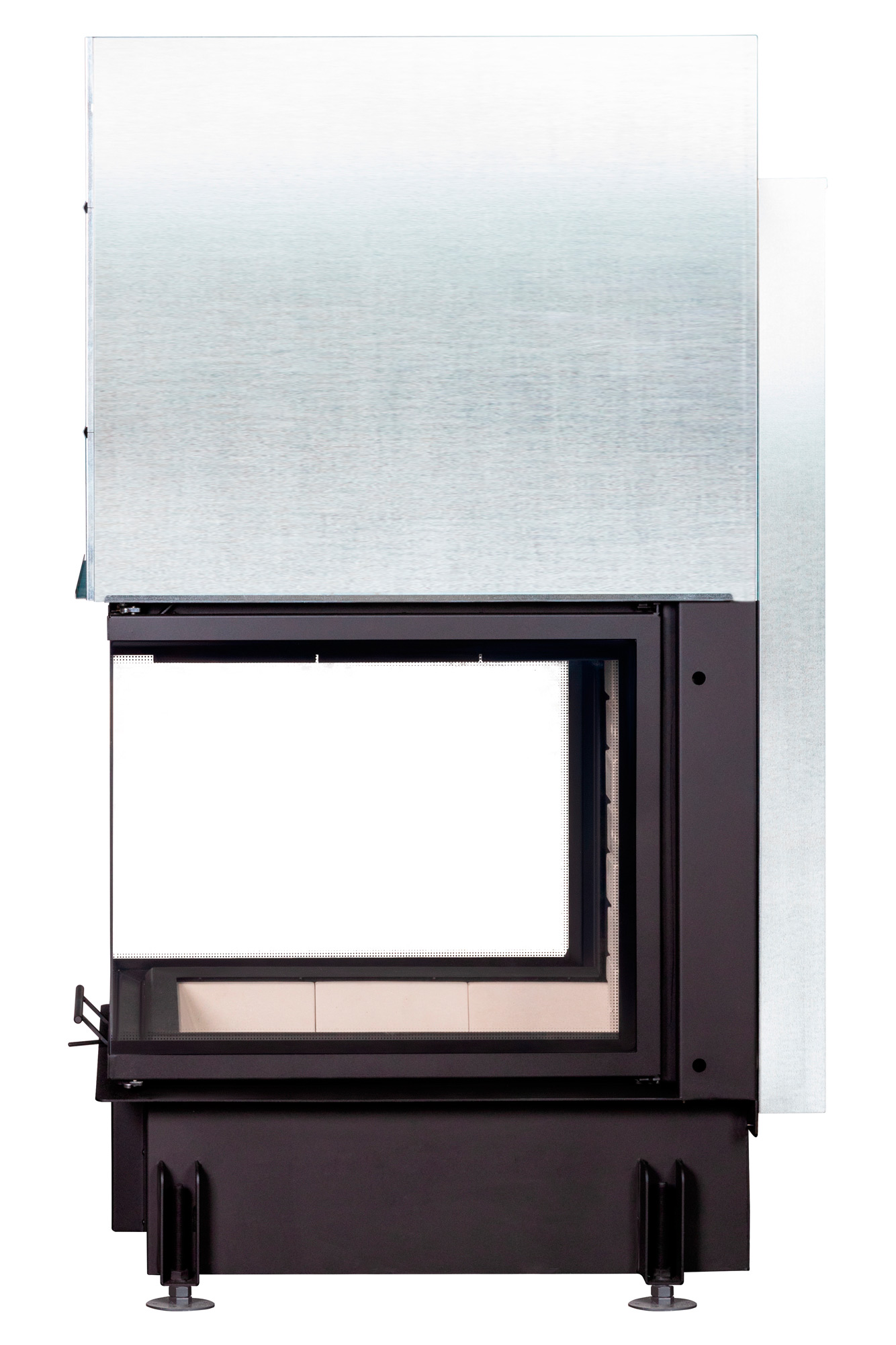 Жаропрочное стекло из Японии выдерживает температуру до 750 °C, оставаясь прочным и прозрачным. Система «чистое стекло» предотвращает образование копоти, а высокий дымосборник и пламярассекатель полностью исключают попадание дыма в помещение.