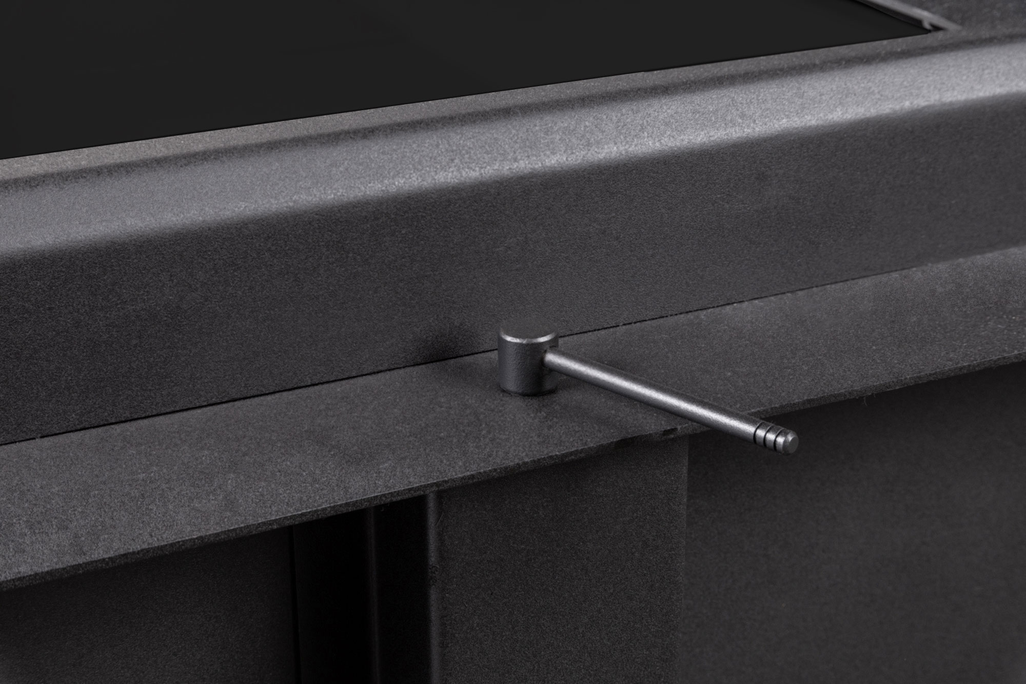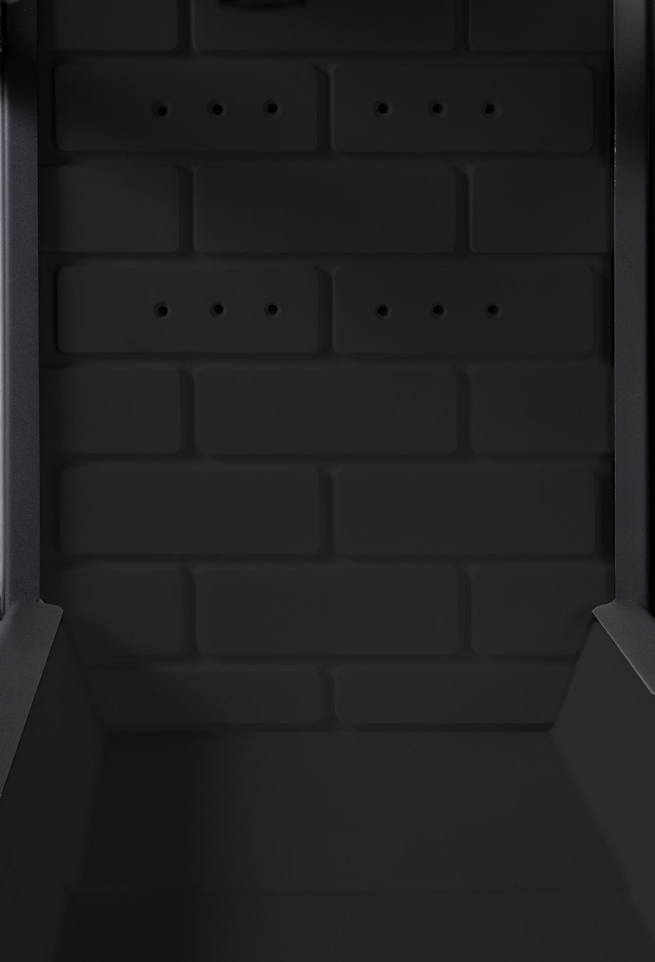 Чёрная футеровка из шамота придаёт топке особую глубину и выразительность, выгодно подчёркивая игру огня. Стильное сочетание чёрного шамота и прозрачного стекла превращает её в центральный декоративный элемент гостиной или загородного дома.