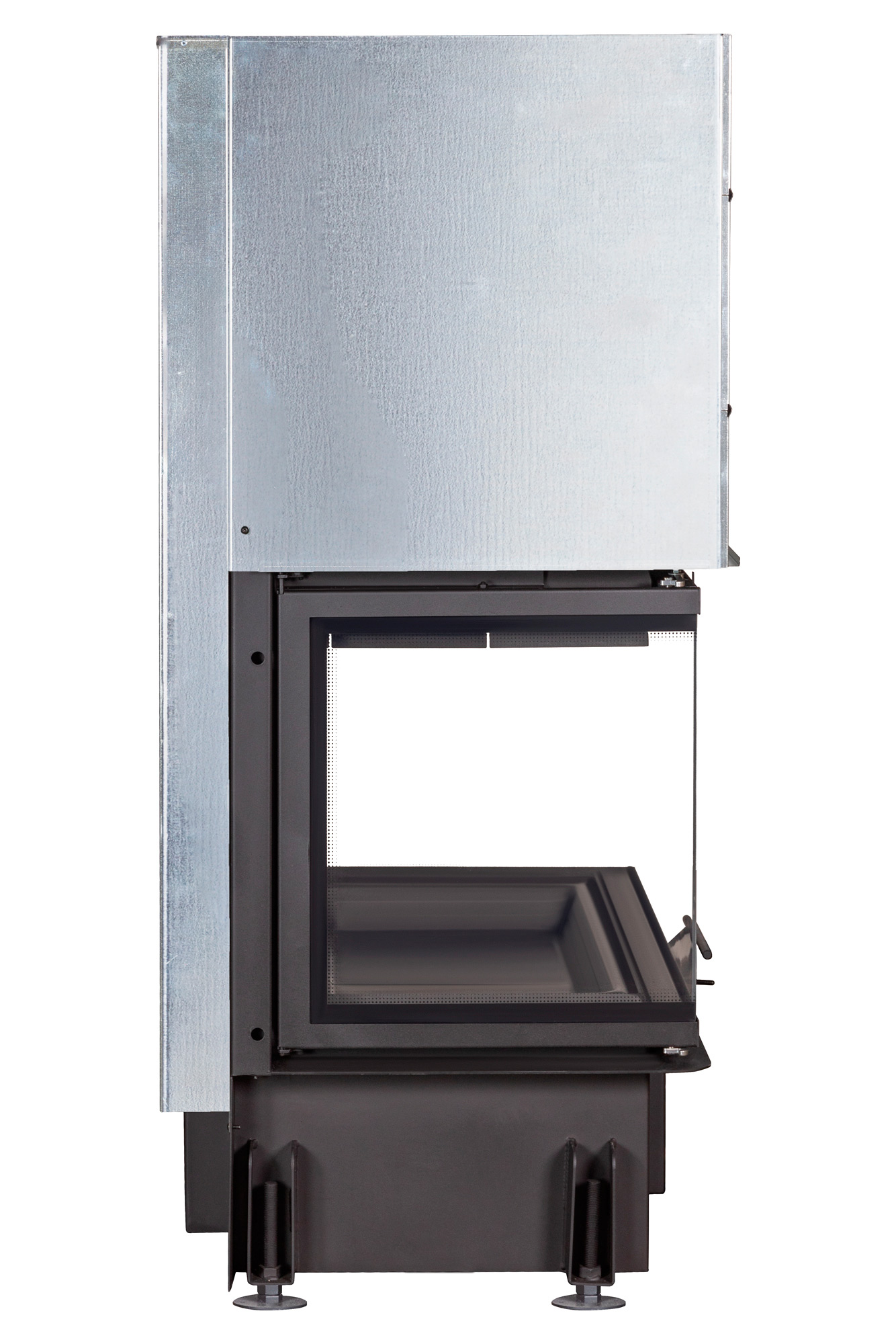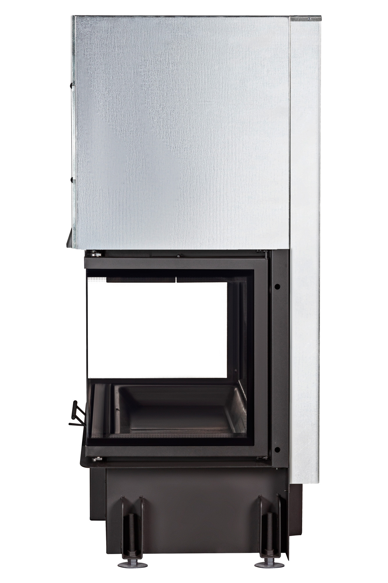 Подовое горение обеспечивает равномерное распределение тепла и экономный расход дров, а черный шамот внутри топочной камеры подчеркивает глубину пламени и делает дизайн камина особенно выразительным.
