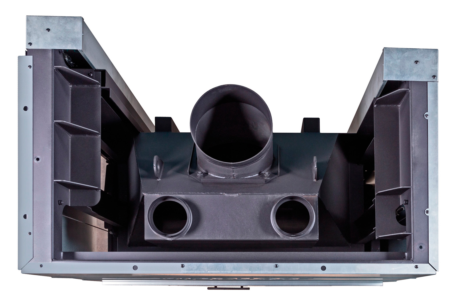 Топка оснащена системой вторичного дожига, которая увеличивает КПД до 80%, что позволяет экономить дрова и обеспечивать более эффективное горение. Это решение не только экономит ваши ресурсы, но и делает процесс отопления экологичнее, за счет более полного сгорания топлива. Два встроенных патрубка для тепловой разводки позволяют распределять теплый воздух в смежные помещения, что значительно увеличивает площадь отапливаемого пространства до 420 м³. Это делает топку подходящей для больших домов и коттеджей, где требуется равномерное отопление.