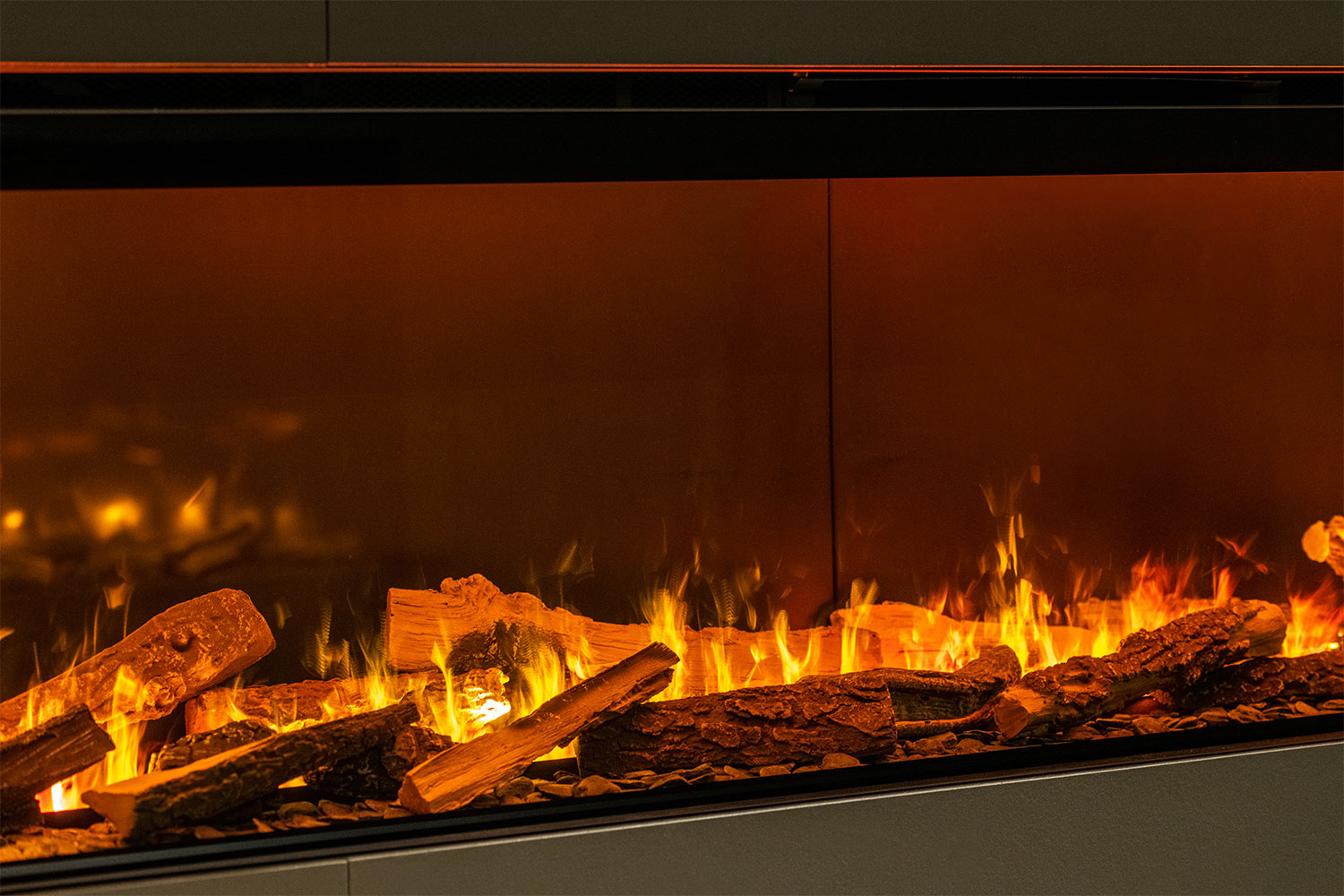 За ощущение «настоящего» очага отвечает не только пламя. Топочная корзина декорируется фактурными керамическими поленьями, а звуковая имитация потрескивания древесины добавляет тот самый эффект присутствия, когда камин воспринимается всем телом, а не только глазами.