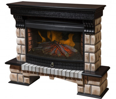 Каминные полки, сделанные из МДФ и облицованные натуральным шпоном благородных пород дерева дуба, махагона или венге опираются на объемные резные консоли. Деревом в тон облицована ниша электроочага и маленькие полочки по бокам портала. Диким опаленным камнем облицованы боковые стенки портала и основание, в котором устроена декоративная ниша для дров.