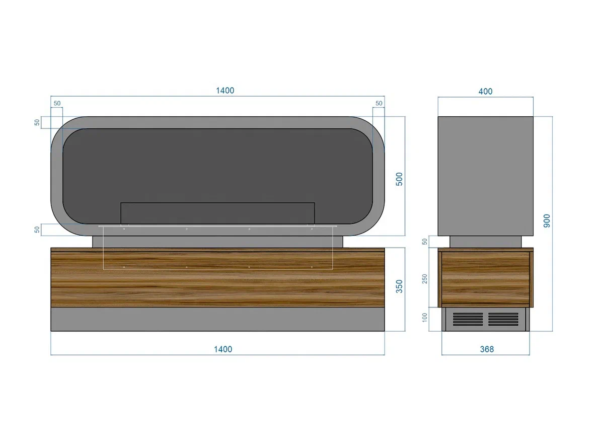 Размеры (900×1400×400 мм) дают эффект большого очага и при этом не перегружают пространство. Решение рассчитано для помещений от 38 м² — чтобы огонь смотрелся уместно и впечатляюще.