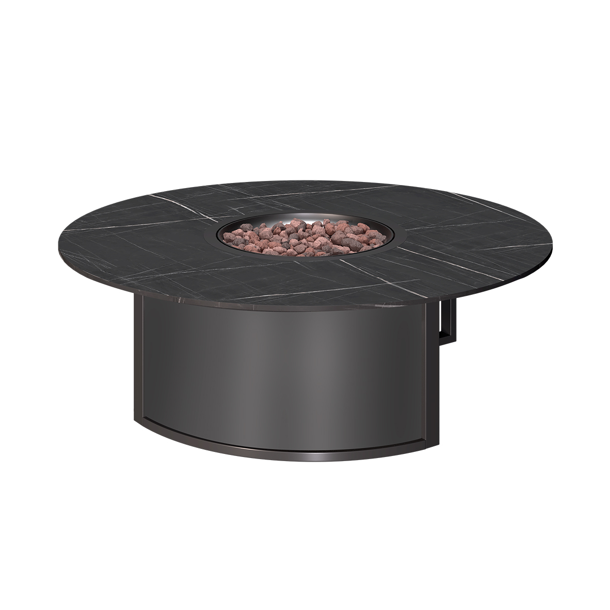Модель предназначена для использования на улице, выполнена из спеченного камня и алюминия и представлена в темно-сером цвете. Такое сочетание материалов и оттенка делает камин не только эффектным внешне, но и уместным для современной террасы, двора или лаунж-зоны под открытым небом.