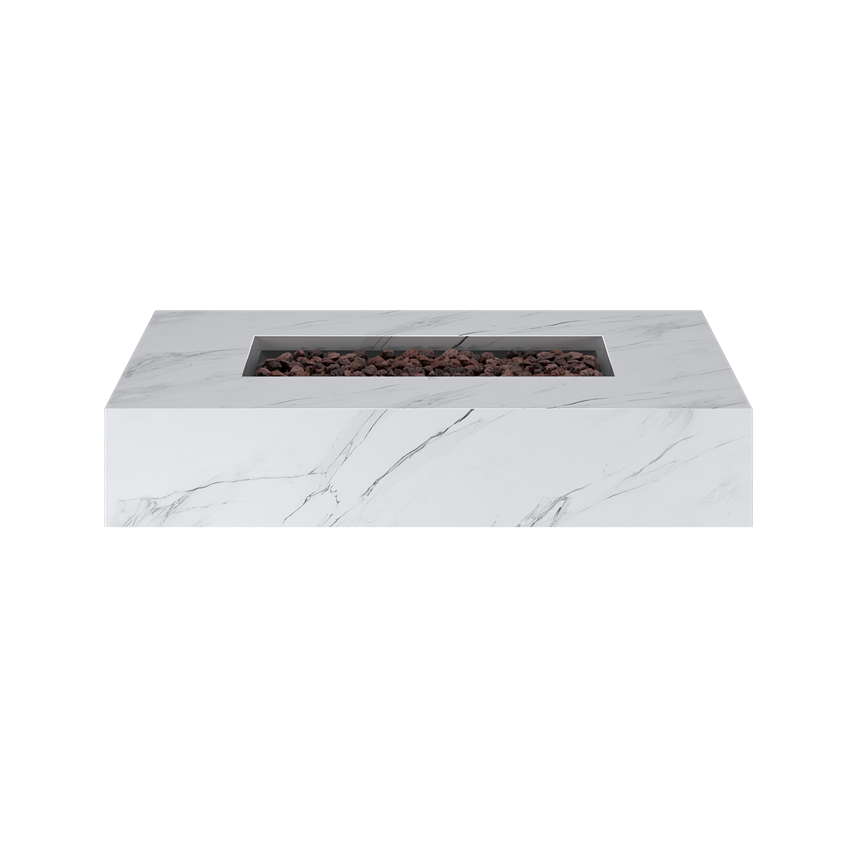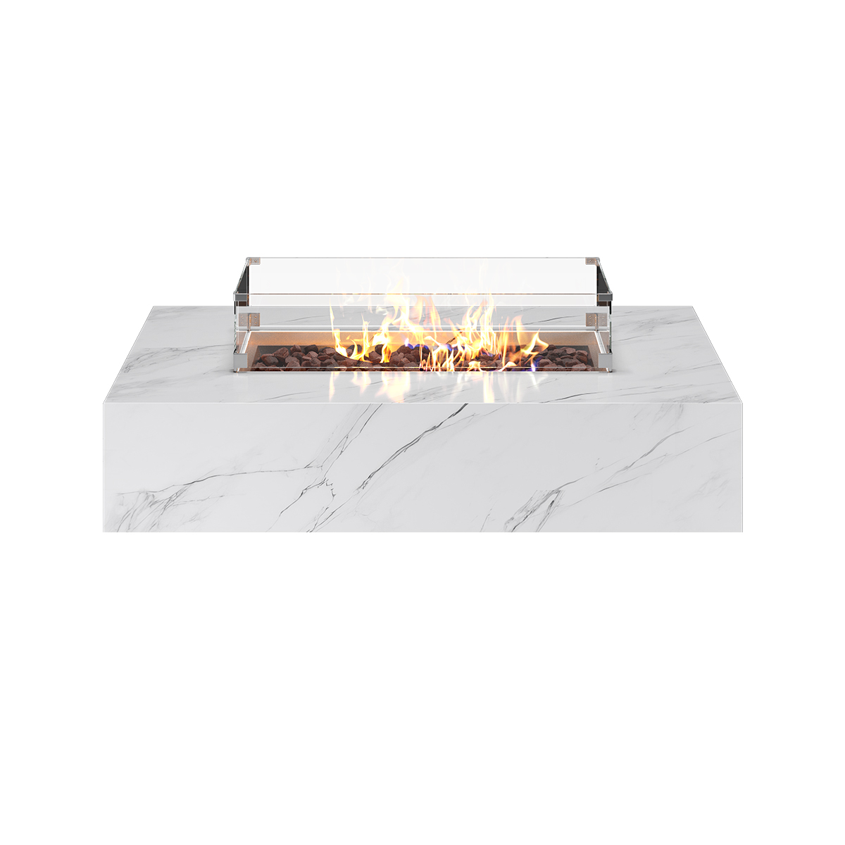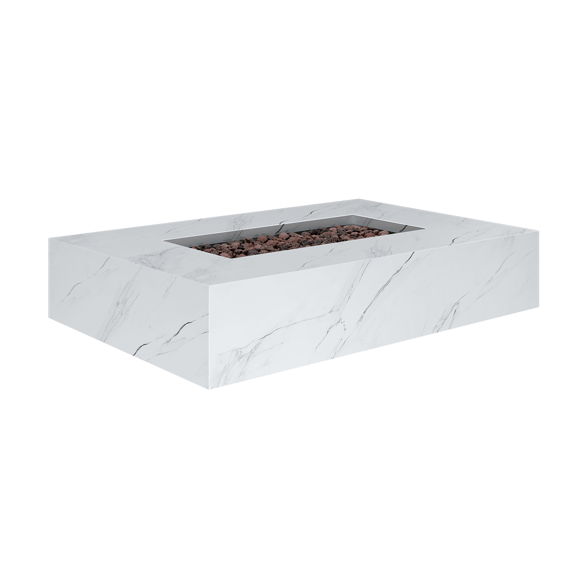 Модель выполнена из спеченного камня — на сайте бренда этот материал назван инновационным, прочным и экологичным, полностью состоящим из минералов. Там же отмечено, что он практичнее гранита, а значит, камин сочетает выразительный внешний вид с удобством и надежностью в повседневной эксплуатации на улице.