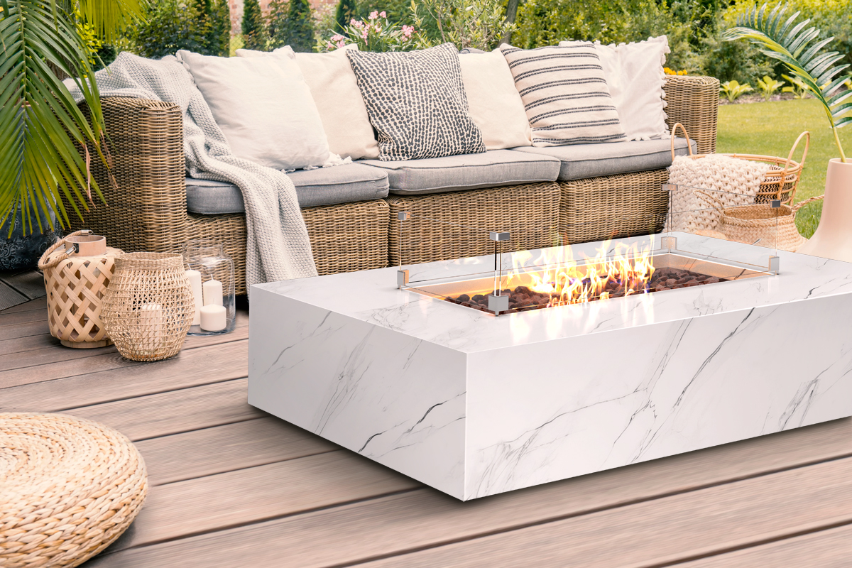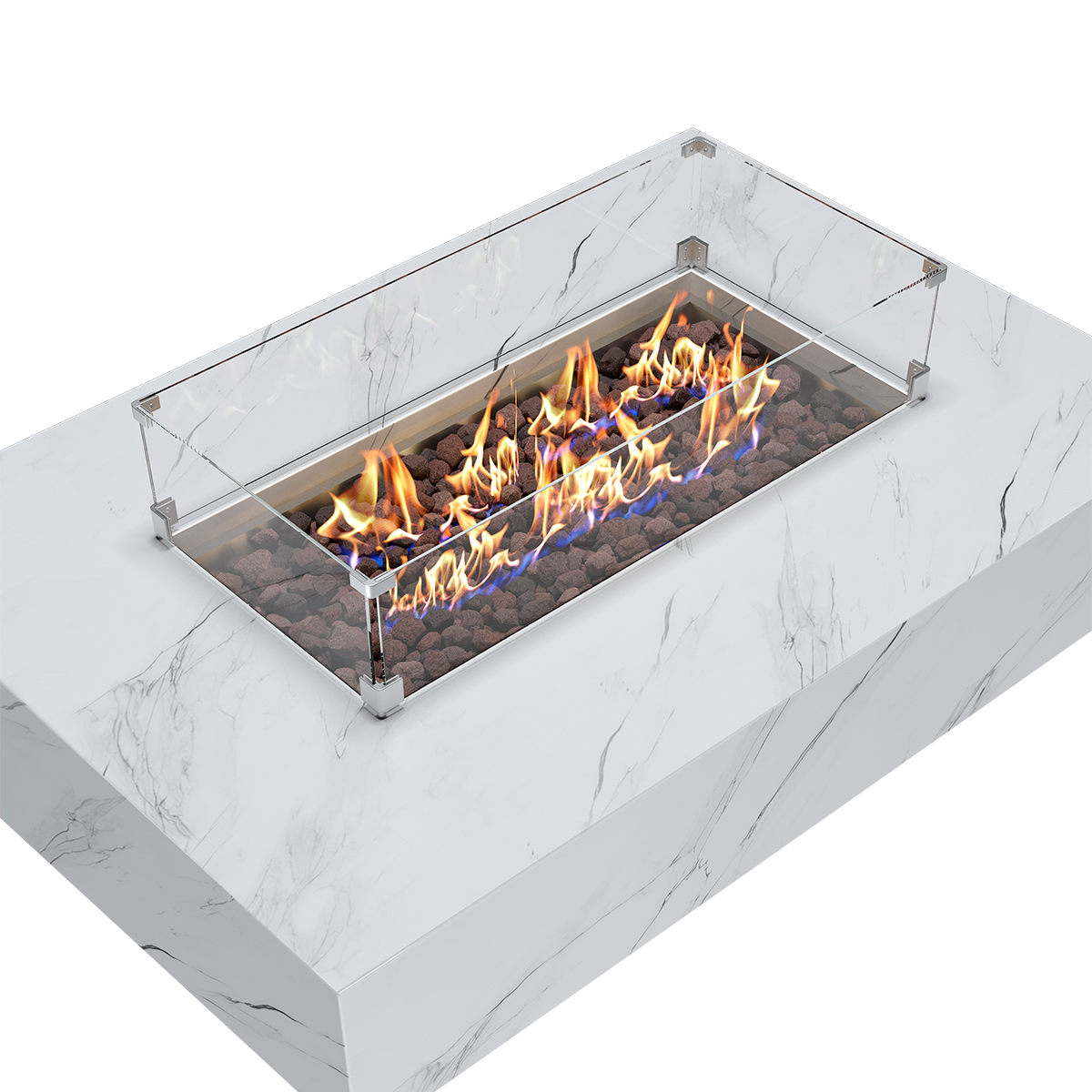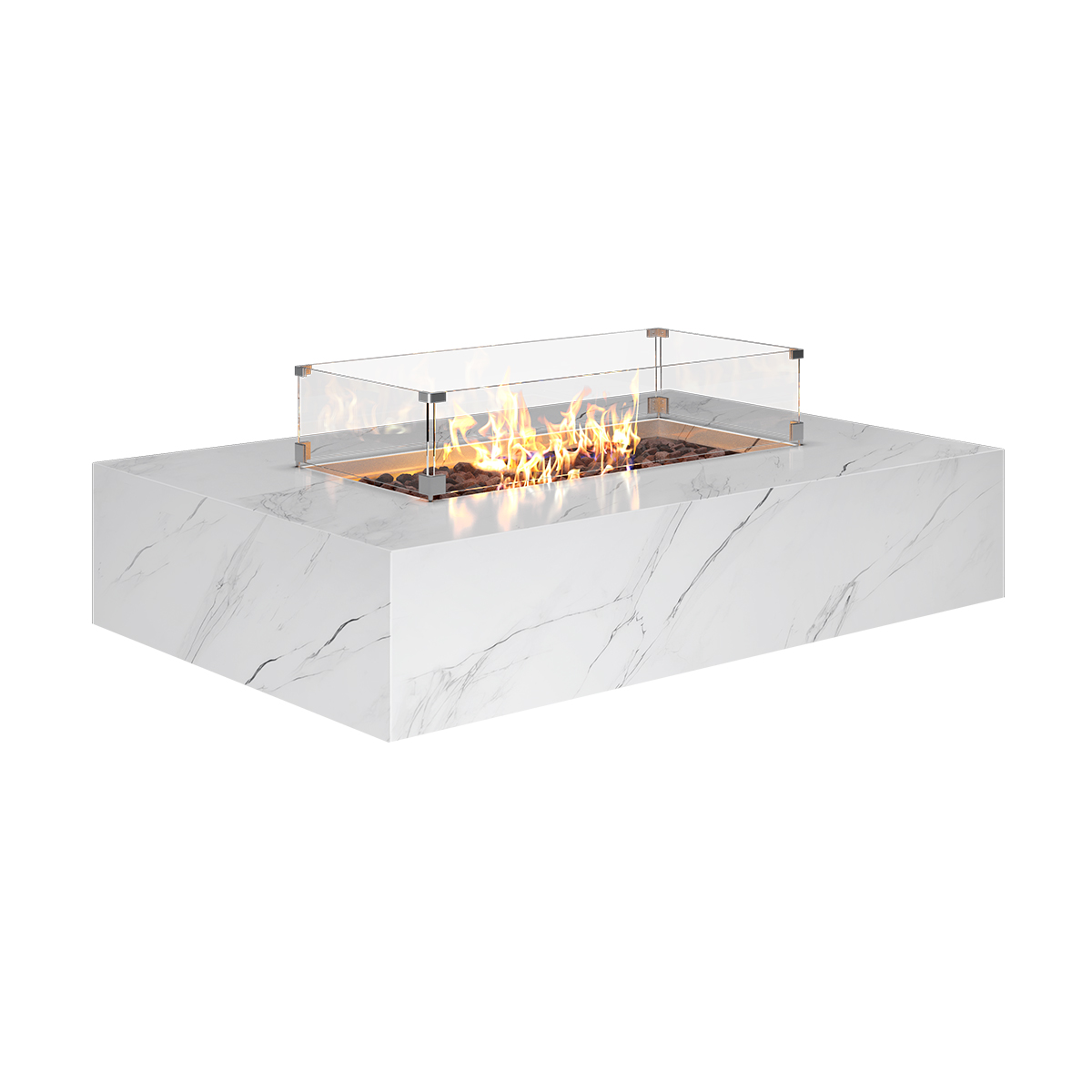Модель выполнена из спеченного камня — на сайте бренда этот материал назван инновационным, прочным и экологичным, полностью состоящим из минералов. Там же отмечено, что он практичнее гранита, а значит, камин сочетает выразительный внешний вид с удобством и надежностью в повседневной эксплуатации на улице.
