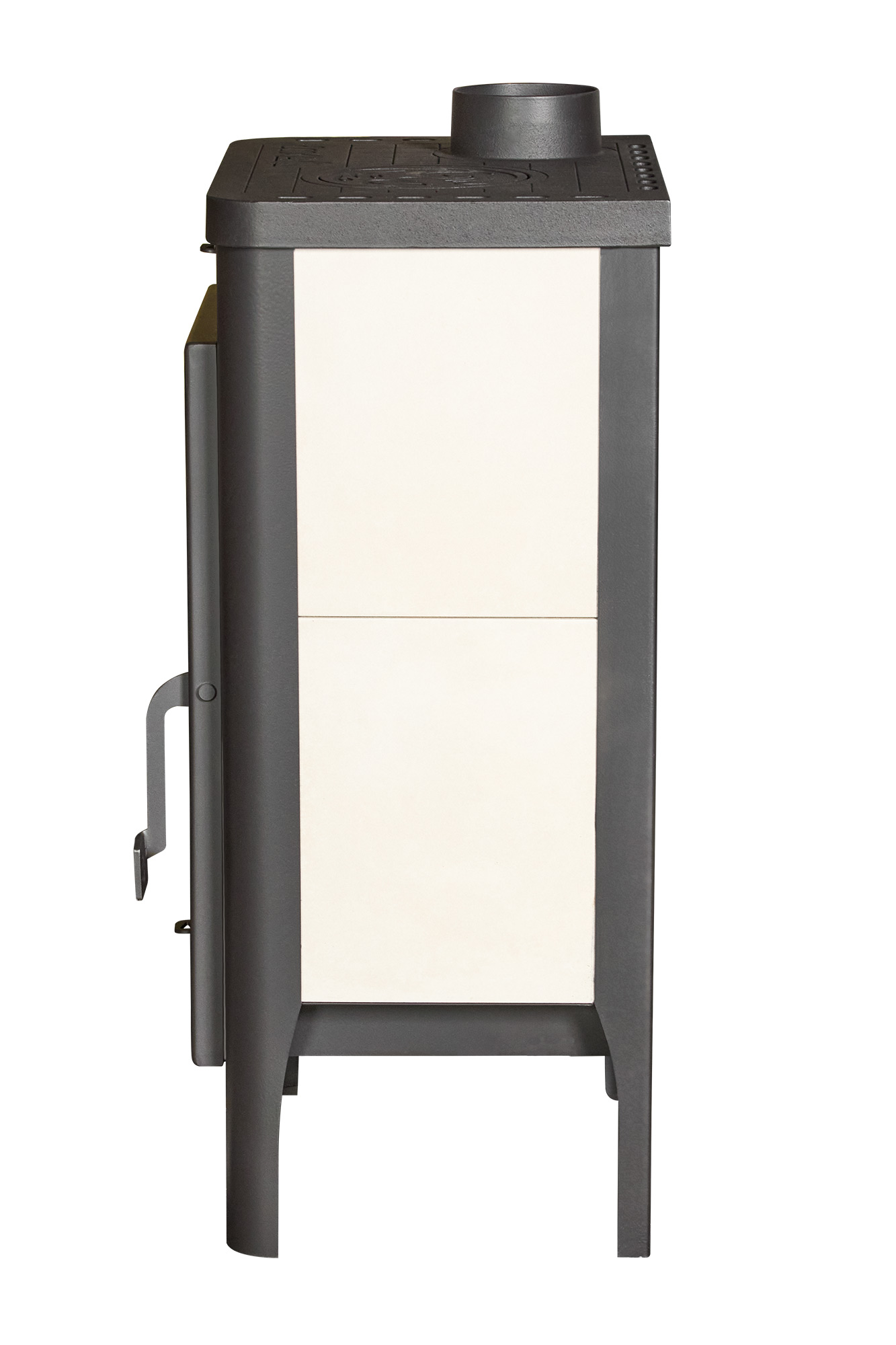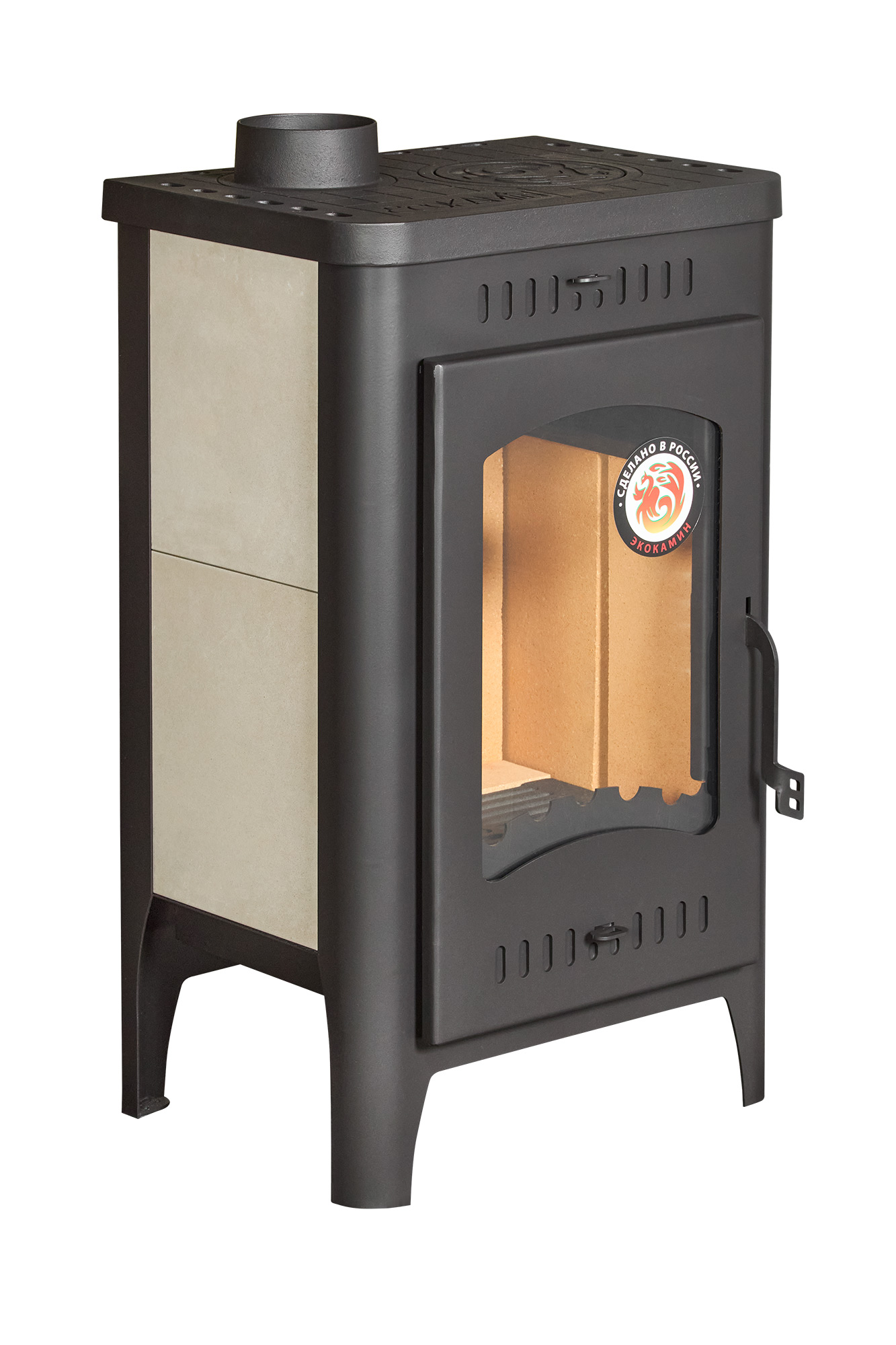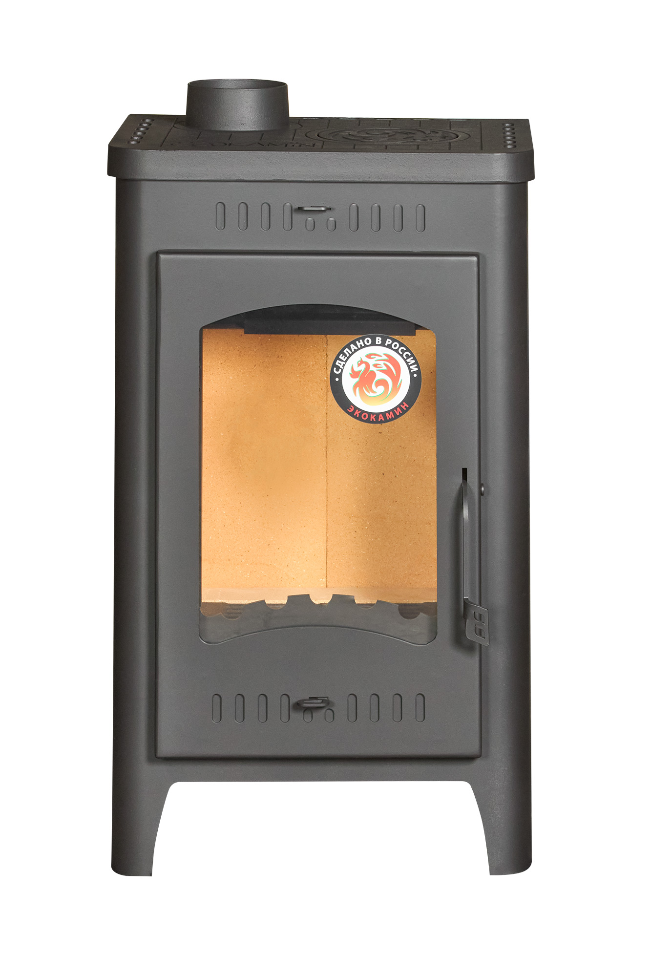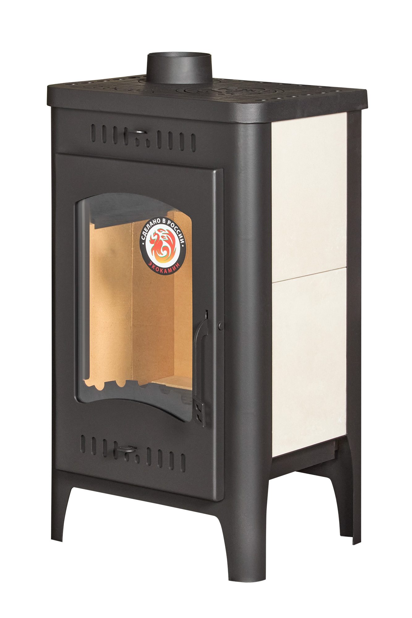 Прямое термостойкое стекло выдерживает температуру до 750 °C и позволяет безопасно наслаждаться пламенем. Большая дверца делает обзор огня особенно выразительным, поэтому печь-камин не просто обогревает помещение, а создает полноценный каминный эффект, наполняя пространство теплым светом и домашним уютом.