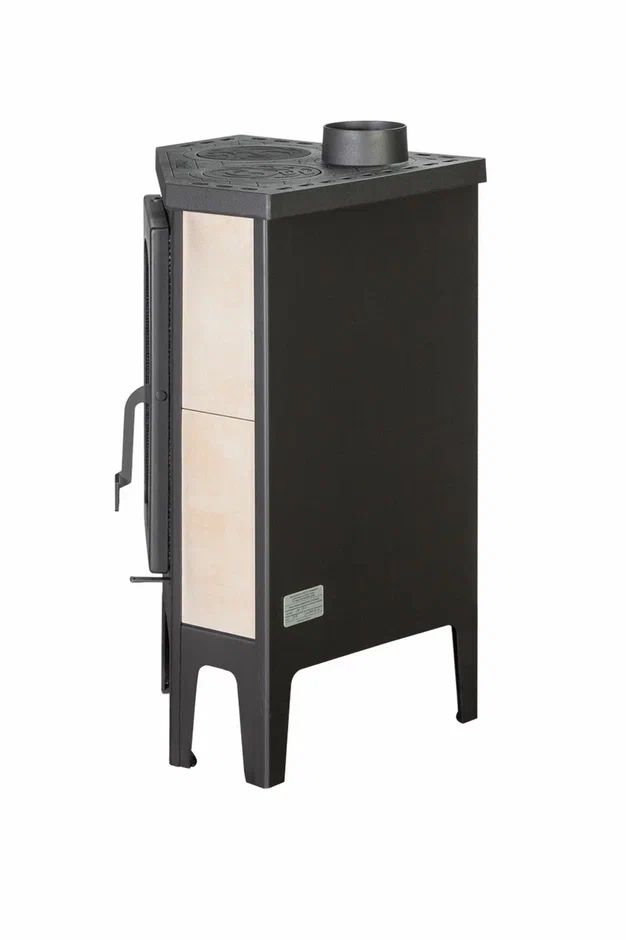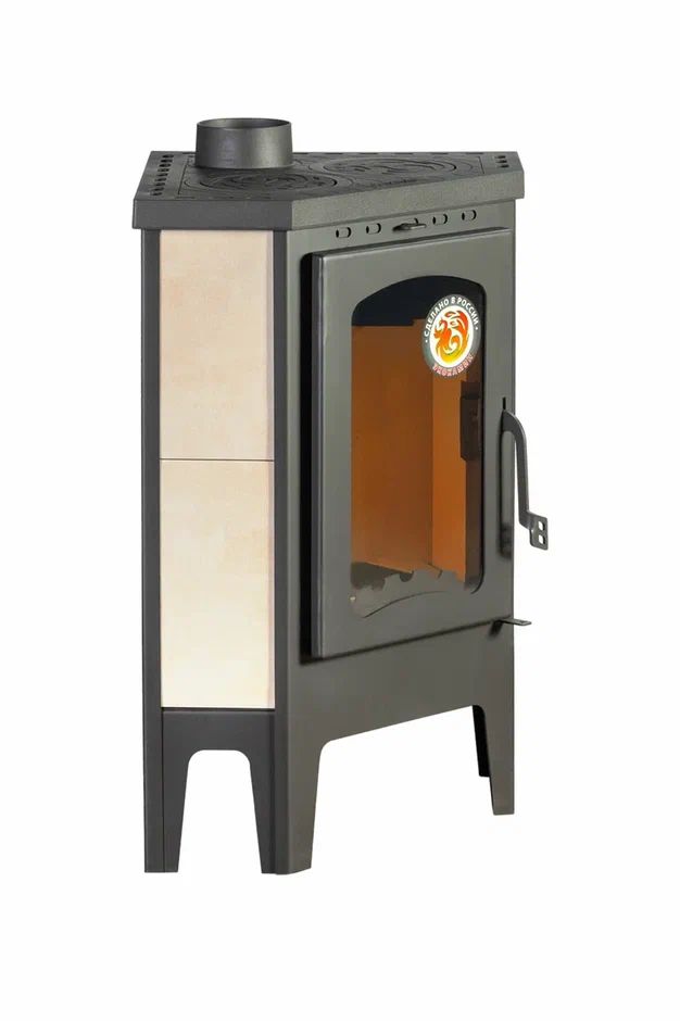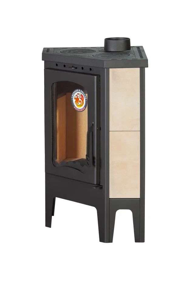 Керамическая плитка в облицовке придает печи-камину более уютный и завершенный внешний вид. Боковое открывание дверцы делает эксплуатацию удобной, а верхнее подключение дымохода помогает легче встроить модель в интерьер и организовать аккуратную установку без лишних сложностей.
