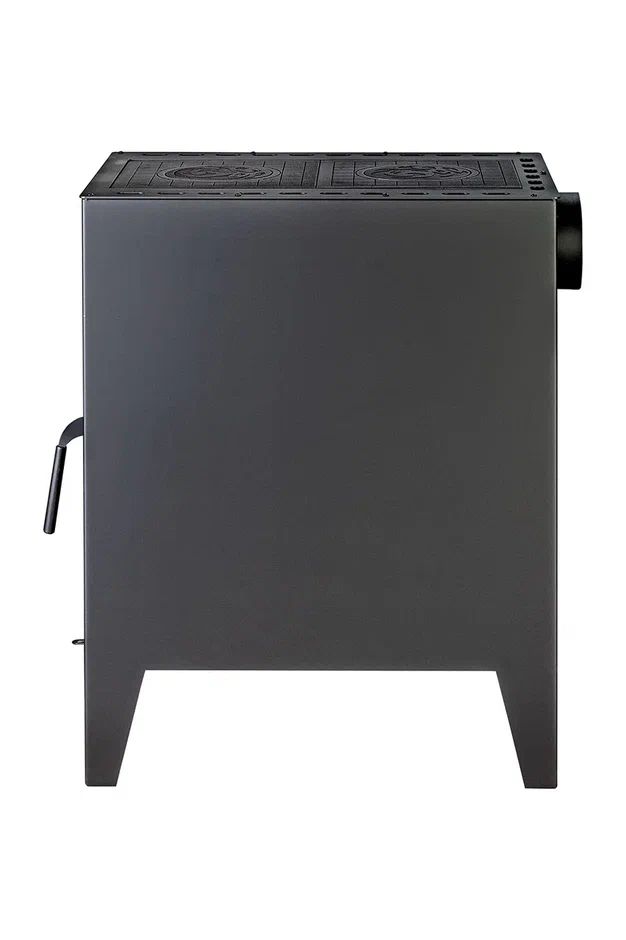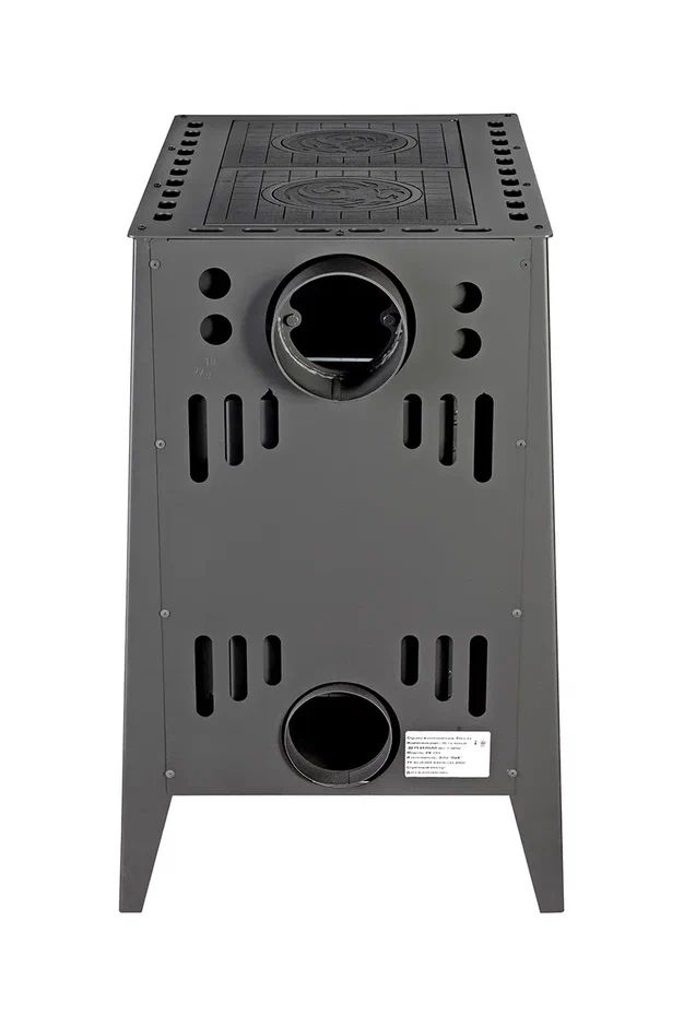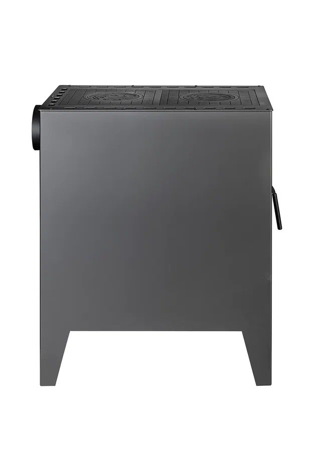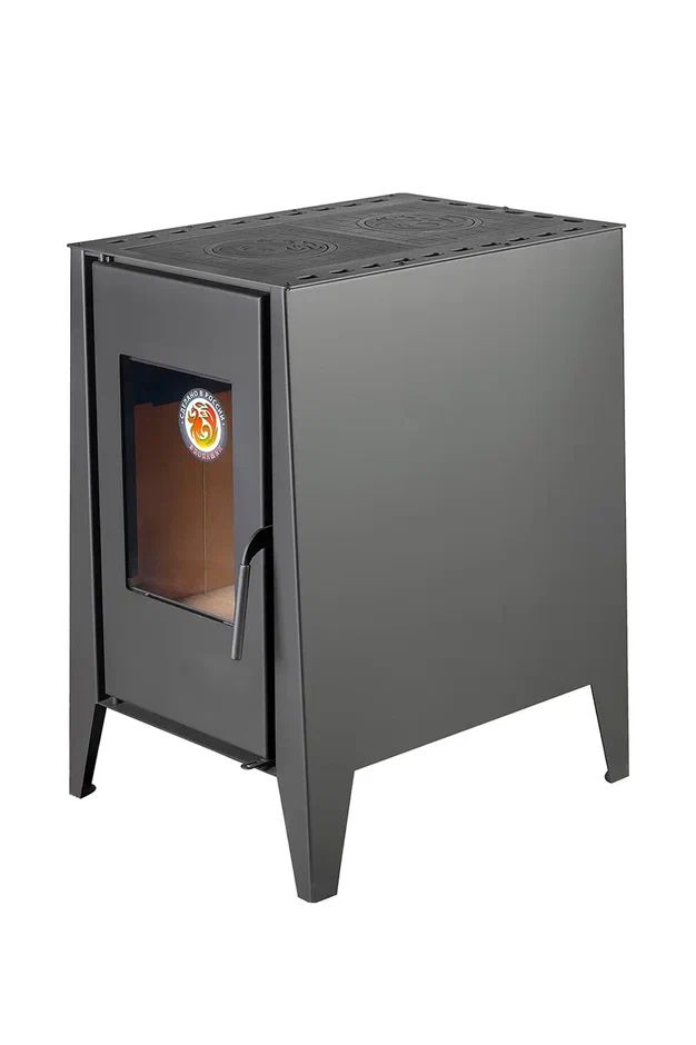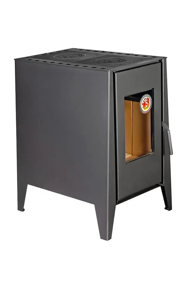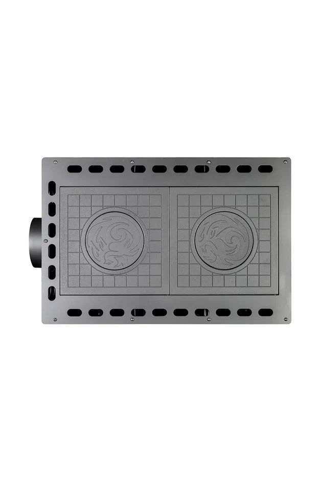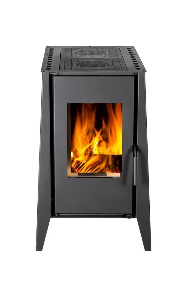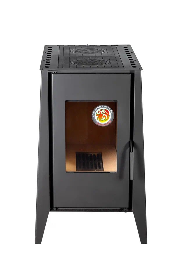 Печь-камин оснащена двумя чугунными варочными поверхностями со съемными конфорками, что делает ее особенно удобной в быту. На ней можно готовить еду, разогревать блюда и кипятить воду, поэтому модель отлично подходит для дачи, загородного дома и любых условий, где важно совместить отопление и кухонную функциональность.