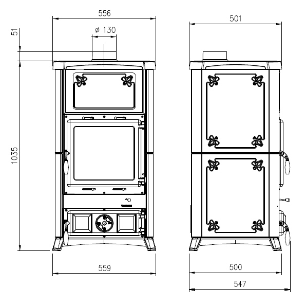 Верхнее подключение дымохода и патрубок диаметром 130 мм подходят для стандартных схем монтажа и помогают аккуратно организовать дымоудаление. Габариты 559×1035×500 мм и вес 175 кг подчёркивают «старший» класс модели и её ориентированность на более просторные помещения.