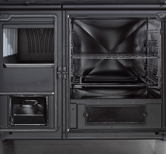 Сверху установлена чугунная варочная плита с двумя конфорками, выполненная из полированного чугуна. Конфорки оснащены съёмными кольцами — вы можете регулировать интенсивность нагрева и готовить так, как удобно именно вам: от медленного томления до более активного кипячения.