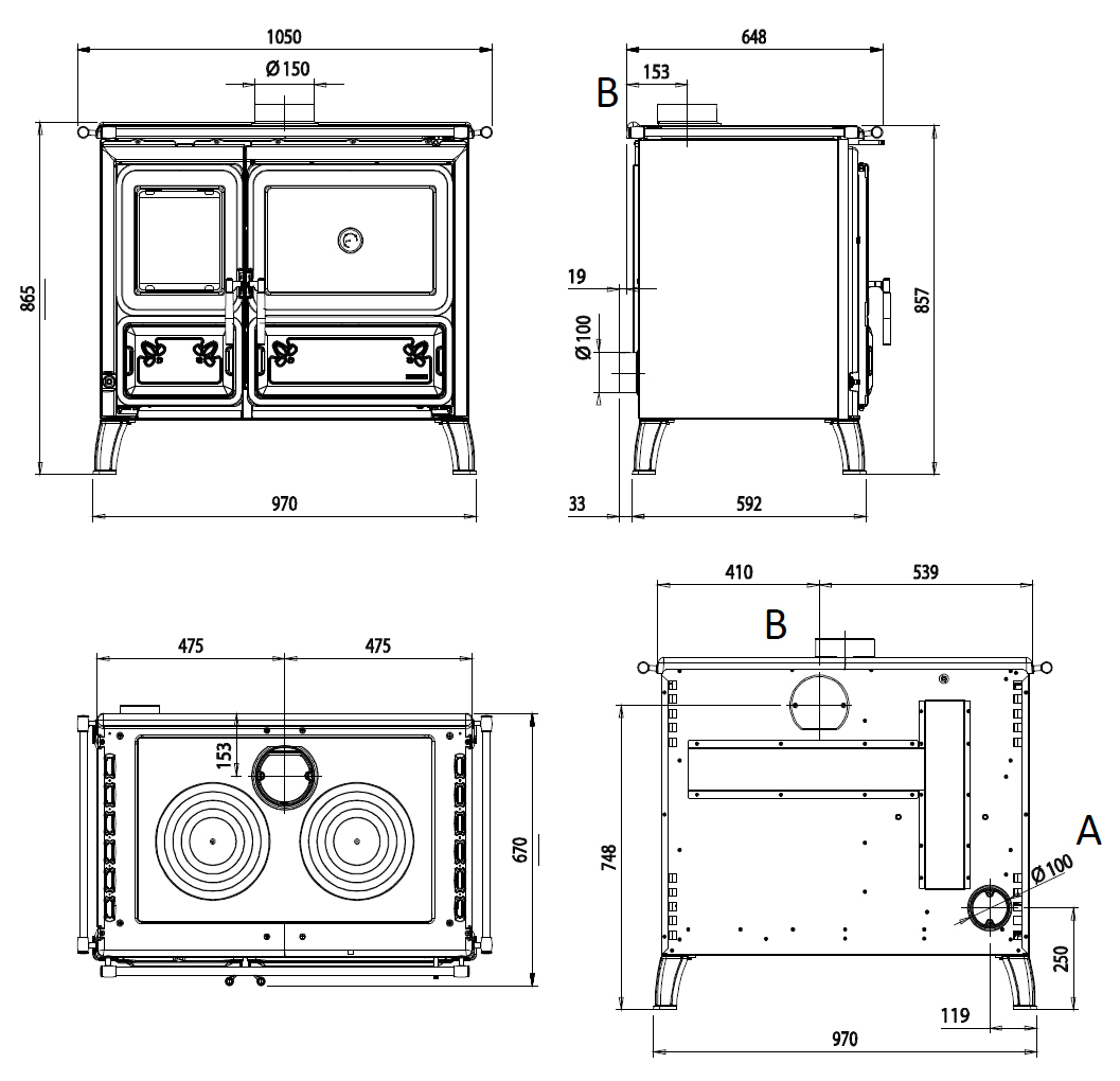 Подключение к дымоходу возможно сверху или сзади — проще адаптировать монтаж под планировку кухни и расположение дымоходного канала. Диаметр патрубка 150 мм обеспечивает уверенную тягу при правильной установке, а конструкция рассчитана на серьёзную тепловую нагрузку.