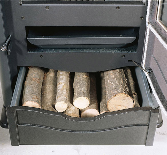 Отдельное преимущество — выдвижной дровник на телескопических направляющих. В нём удобно хранить небольшой запас дров или аксессуары для розжига, чтобы всё необходимое было под рукой и зона вокруг печи выглядела аккуратно.
