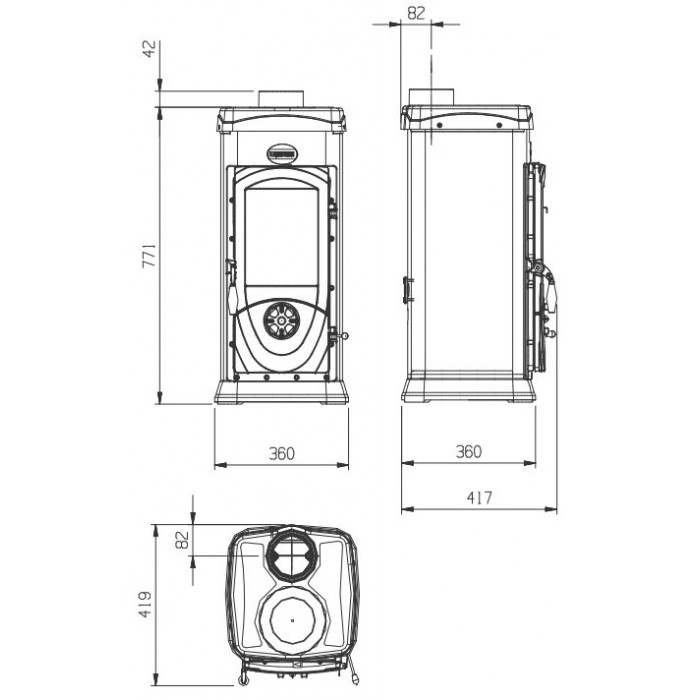Печь имеет топочную решётку и ящик для сбора золы — обслуживание становится быстрее и аккуратнее. Вес 64 кг делает модель достаточно устойчивой, при этом она остаётся удобной для установки и размещения.
