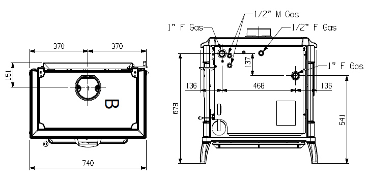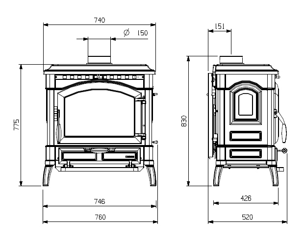 Подключение дымохода верхнее, диаметр патрубка 150 мм. Габариты 746×775×520 мм при весе 212 кг дают ощущение основательной «домашней котельной» в формате печи: чугунная облицовка, сталь/чугун в конструкции и итальянское производство La Nordica.