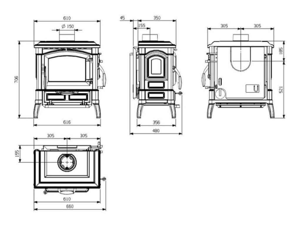 Диаметр дымохода 150 мм подходит для стандартных систем, а верхний вывод обеспечивает удобное и безопасное подключение. Простая конструкция делает монтаж максимально быстрым.