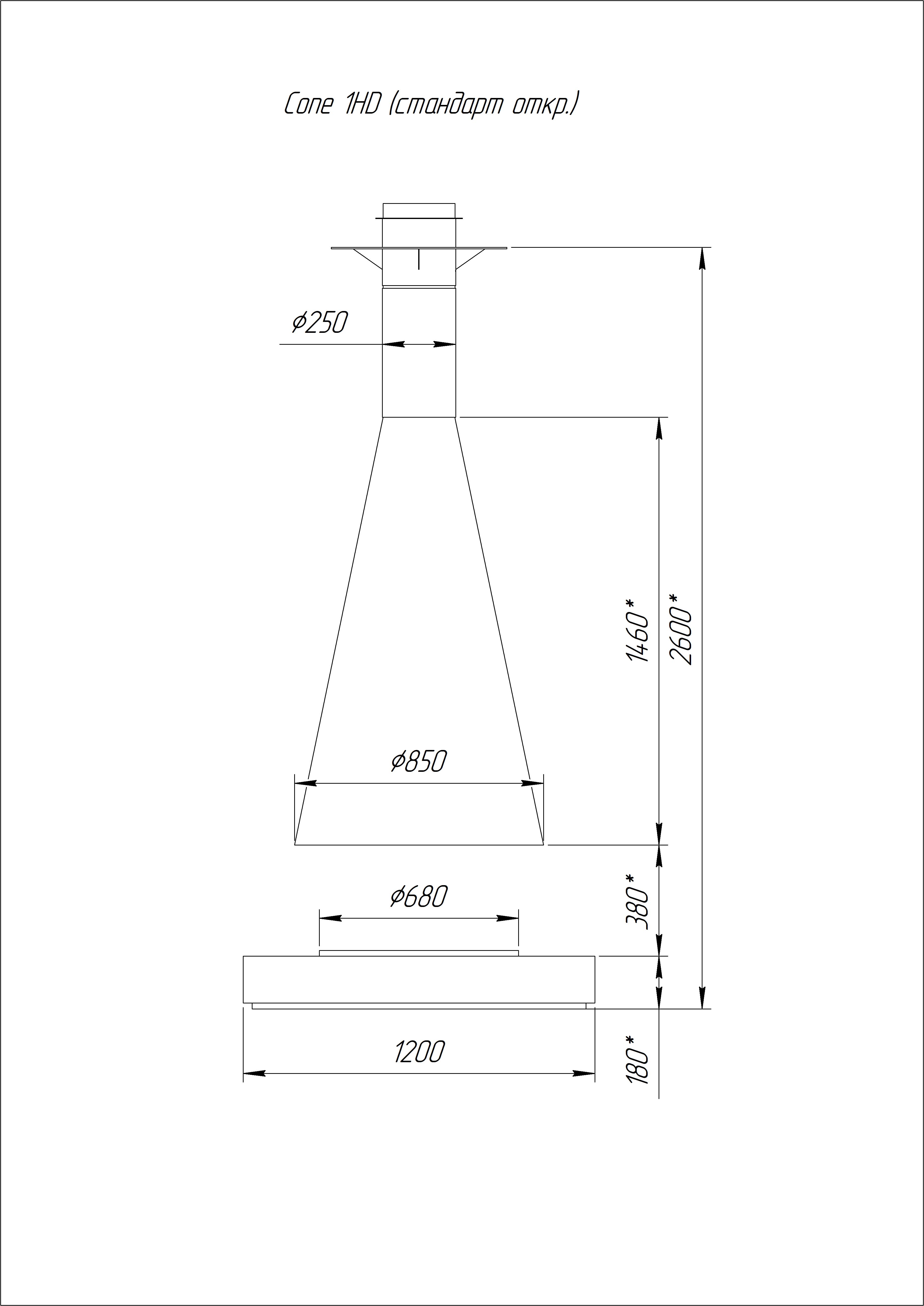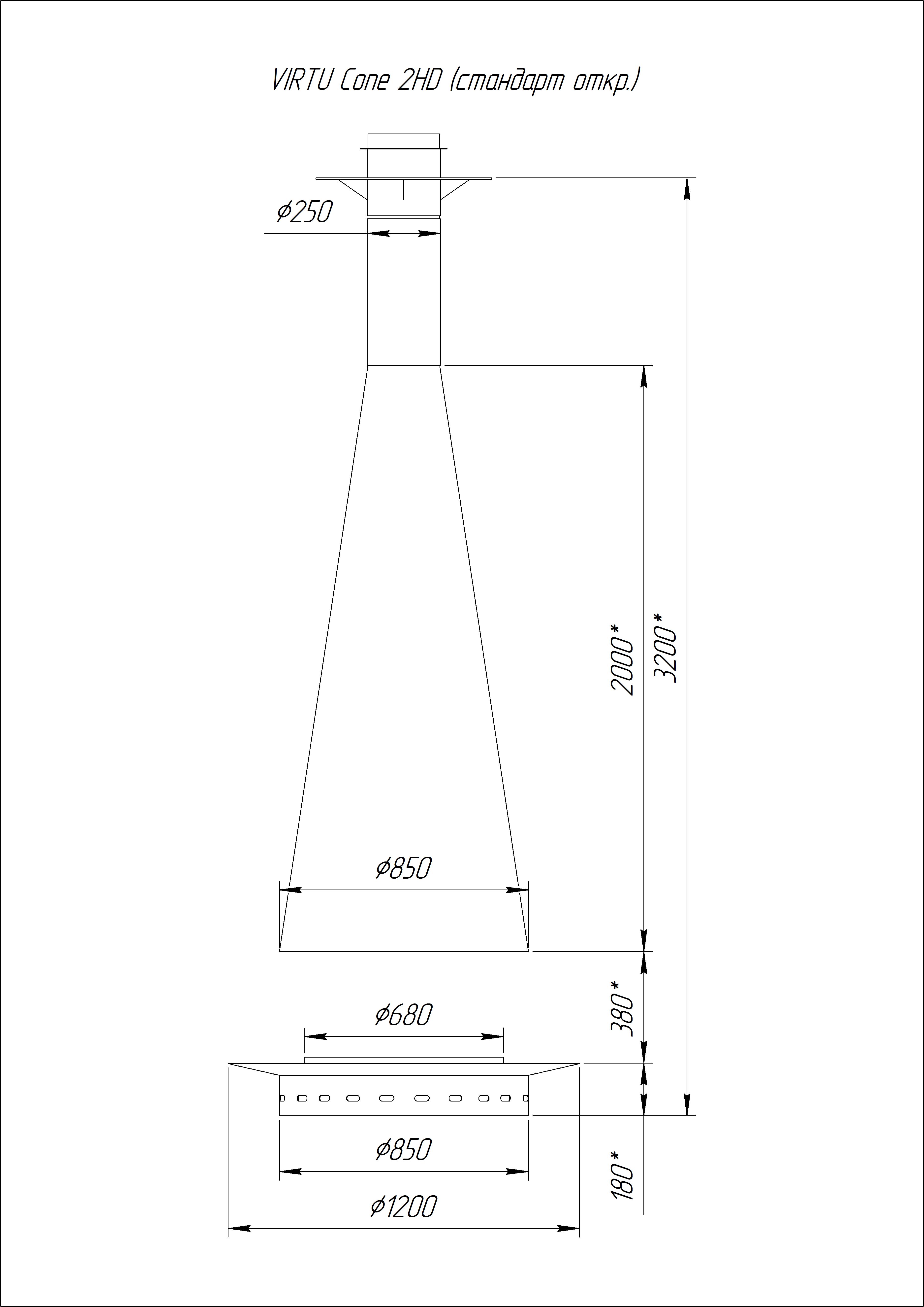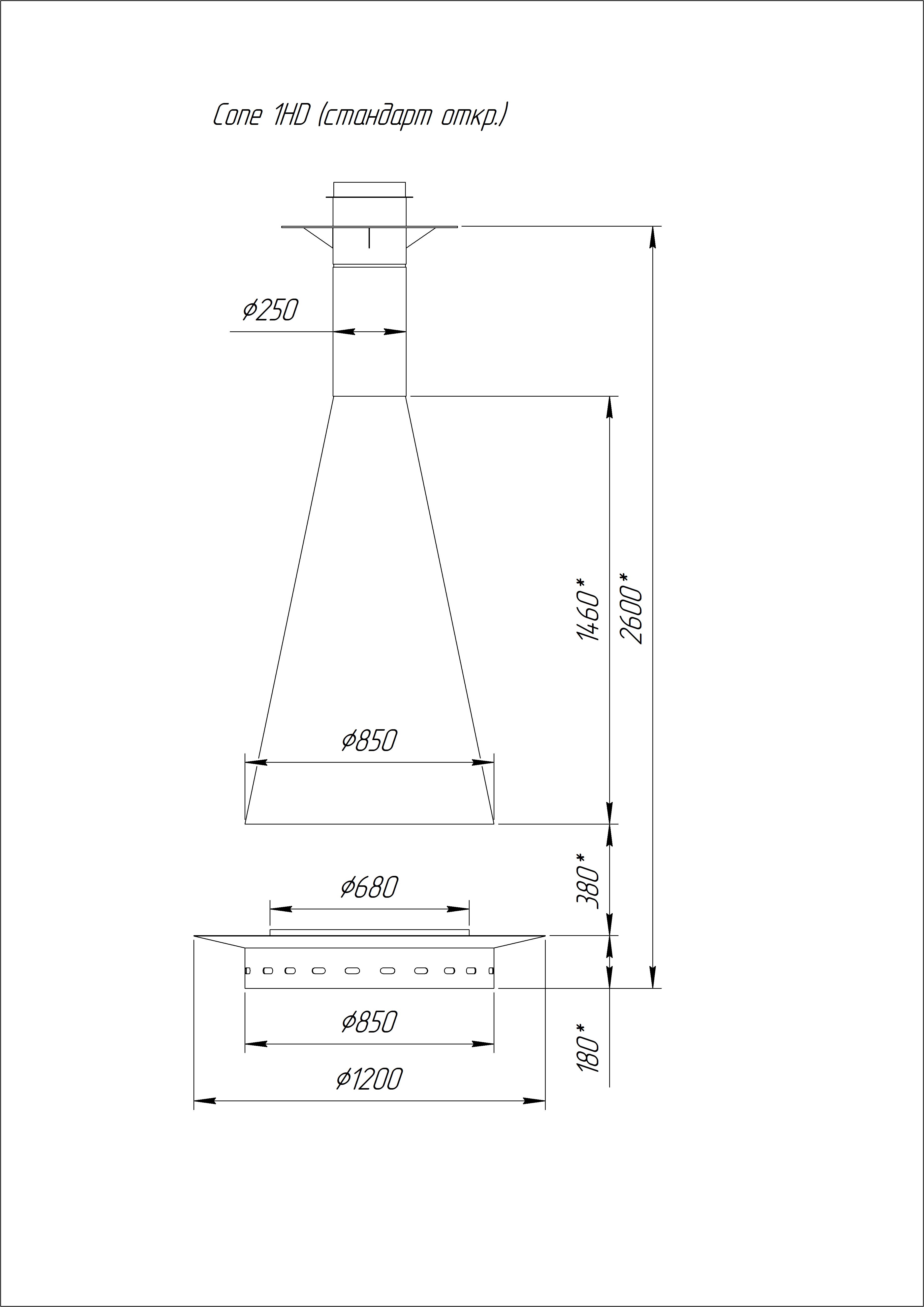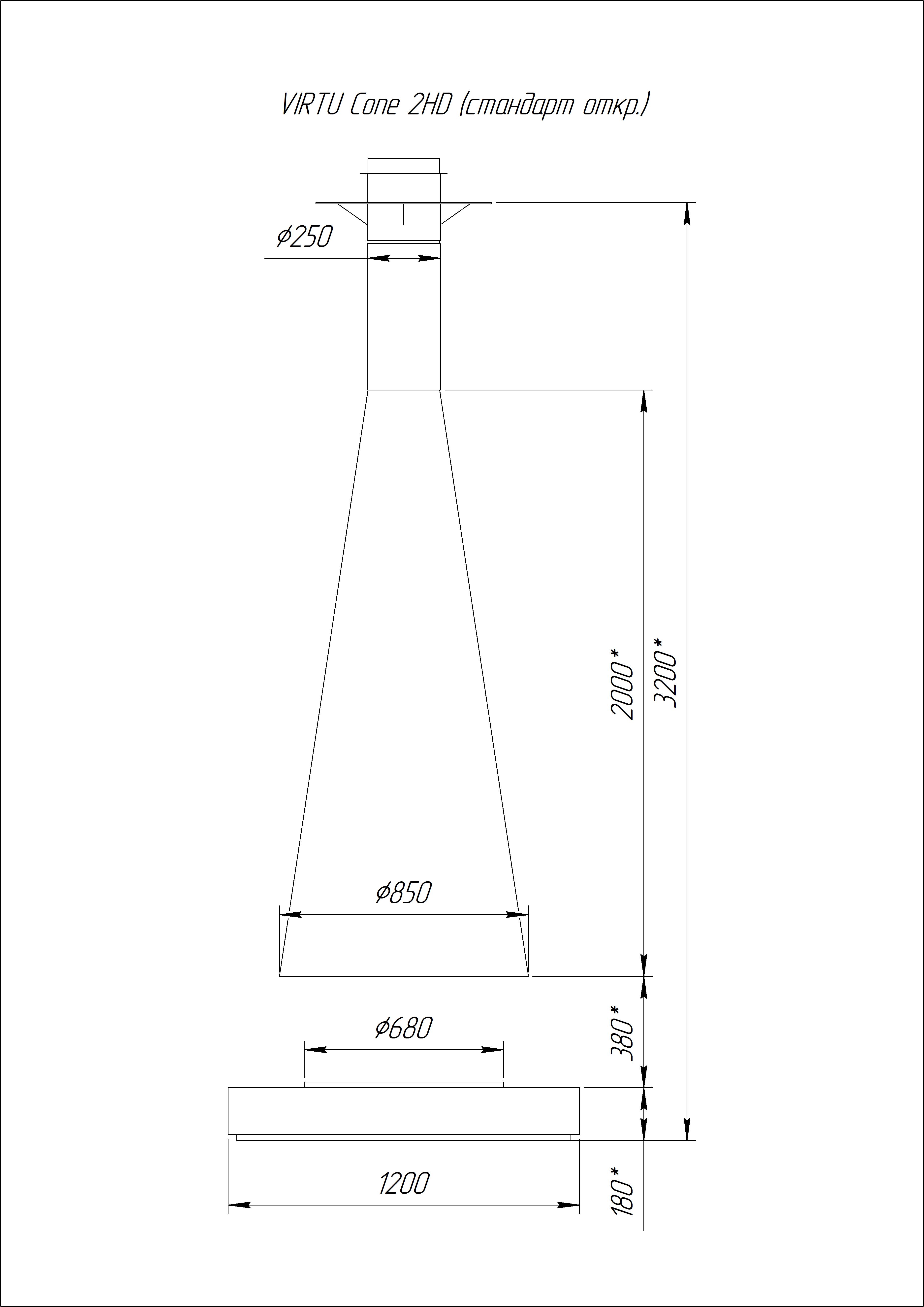 Стандартная высота камина составляет 2,6 метра, что делает его удобным для установки в большинстве жилых и общественных помещений. Размеры конуса в базовой комплектации: 850 мм в диаметре, 2000 мм в высоту и 270 мм в малом диаметре. Благодаря этим пропорциям камин выглядит изящно и при этом сохраняет функциональность.