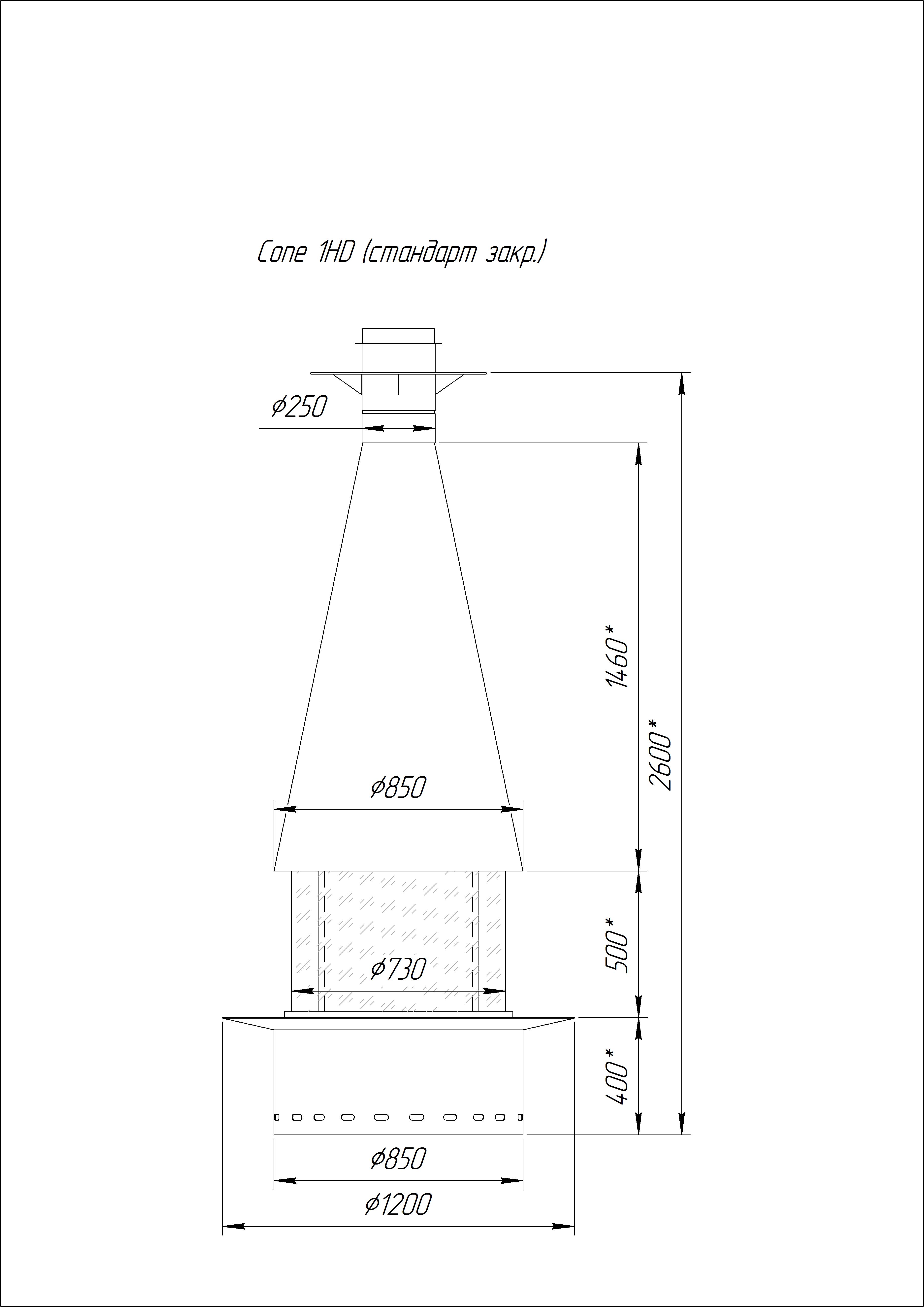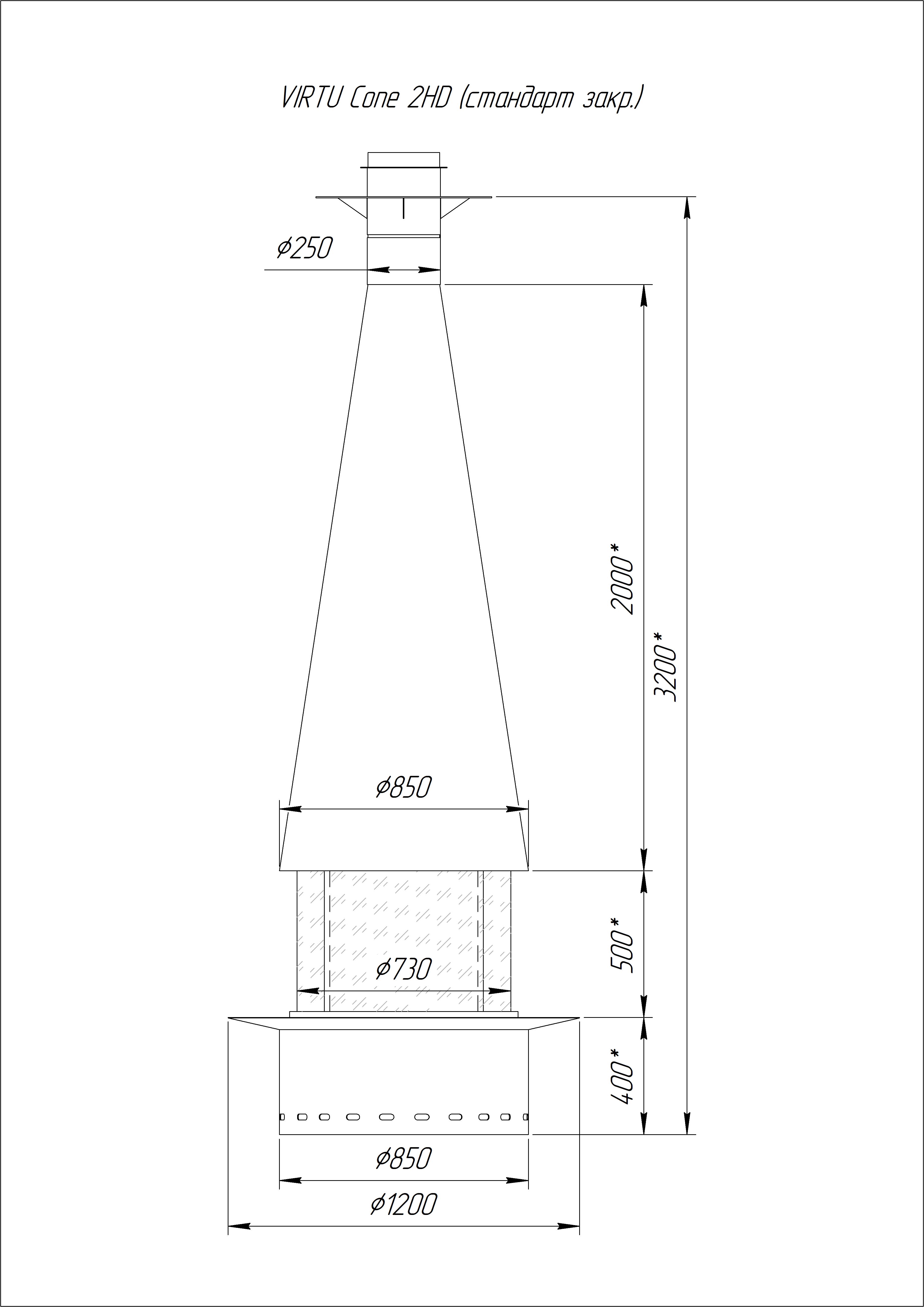 В базовой комплектации камин имеет стандартную высоту 2,6 метра, а размеры конуса составляют: 850 мм диаметр, 2000 мм высота и 270 мм малый диаметр. Эти параметры делают модель универсальной и позволяют устанавливать её в различных пространствах — от частных домов до общественных интерьеров.