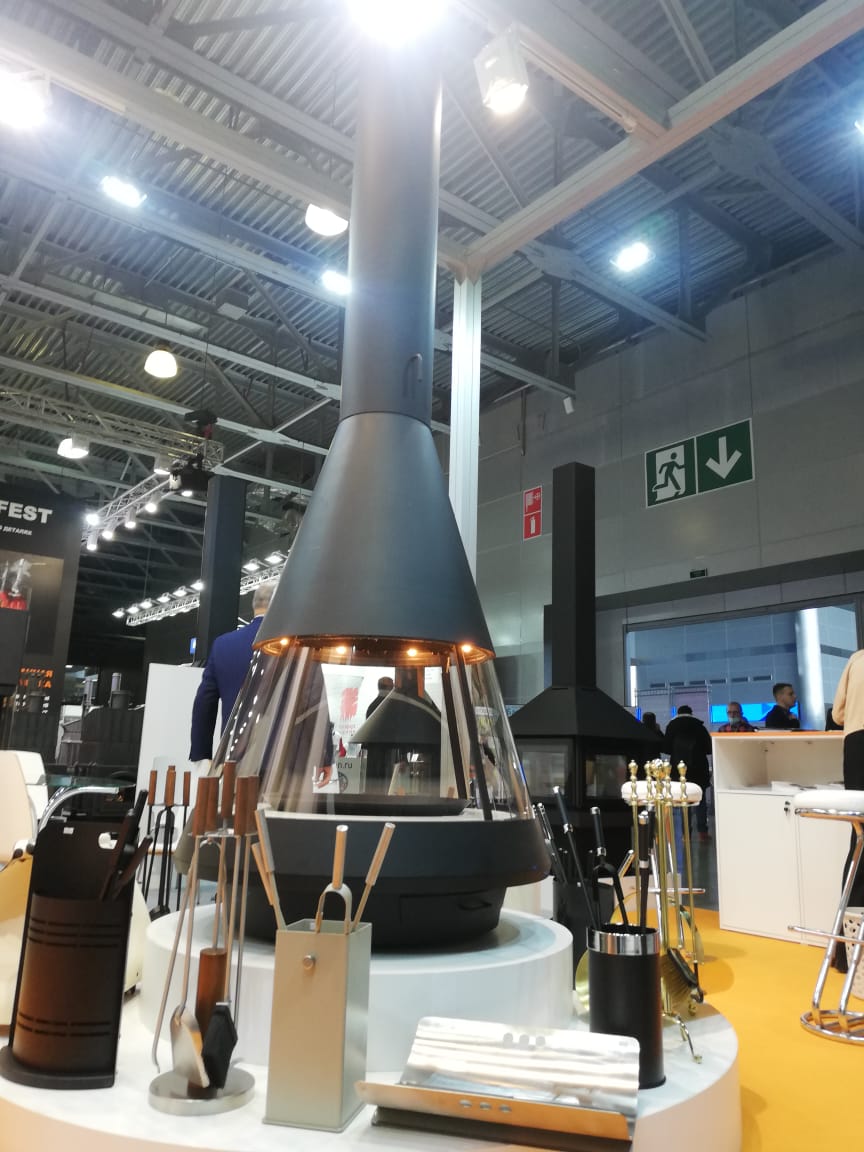 В центе экспозиции флагманская модель от компании Hergom- максимально открытый с круговым остеклением на 360 градусов камин Mallorca.